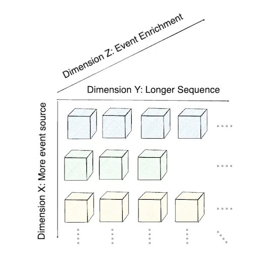 Diverse and enriched data sources are essential for commercial ads-recommendation models to accurately assess user interest both before and after engagement with content. While extended user-engagement histories can improve the prediction of user interests, it is equally important to embed activity sequences from multiple sources to ensure freshness of user and ad-representations, following scaling law principles. In this paper, we present a novel three-dimensional framework for enhancing user-ad representations without increasing model inference or serving complexity. The first dimension examines the impact of incorporating diverse event sources, the second considers the benefits of longer user histories, and the third focuses on enriching data with additional event attributes and multi-modal embeddings. We assess the return on investment (ROI) of our source enrichment framework by comparing organic user engagement sources, such as content viewing, with ad-impression sources. The proposed method can boost the area under curve (AUC) and the slope of scaling curves for ad-impression sources by 1.56 to 2 times compared to organic usage sources even for short online-sequence lengths of 100 to 10K. Additionally, click-through rate (CTR) prediction improves by 0.56% AUC over the baseline production ad-recommendation system when using enriched ad-impression event sources, leading to improved sequence scaling resolutions for longer and offline user-ad representations.
