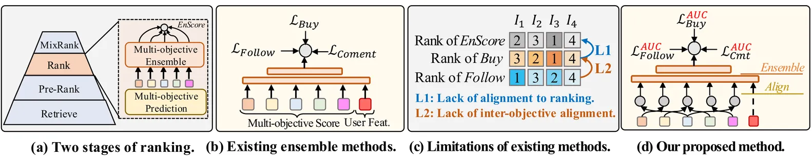 Recommendation for live-streaming e-commerce is gaining increasing attention due to the explosive growth of the live streaming economy. Different from traditional e-commerce, live-streaming e-commerce shifts the focus from products to streamers, which requires ranking mechanism to balance both purchases and user-streamer interactions for long-term ecology. To trade off multiple objectives, a popular solution is to build an ensemble model to integrate multi-objective scores into a unified score. The ensemble model is usually supervised by multiple independent binary classification losses of all objectives. However, this paradigm suffers from two inherent limitations. First, the optimization direction of the binary classification task is misaligned with the ranking task (evaluated by AUC). Second, this paradigm overlooks the alignment between objectives, e.g., comment and buy behaviors are partially dependent which can be revealed in labels correlations. The model can achieve better trade-offs if it learns the aligned parts of ranking abilities among different objectives. To mitigate these limitations, we propose a novel multi-objective ensemble framework HarmonRank to fulfill both alignment to the ranking task and alignment among objectives. For alignment to ranking, we formulate ranking metric AUC as a rank-sum problem and utilize differentiable ranking techniques for ranking-oriented optimization. For inter-objective alignment, we change the original one-step ensemble paradigm to a two-step relation-aware ensemble scheme. Extensive offline experiments results on two industrial datasets and online experiments demonstrate that our approach significantly outperforms existing state-of-the-art methods. The proposed method has been fully deployed in Kuaishou's live-streaming e-commerce recommendation platform with 400 million DAUs, contributing over 2% purchase gain.