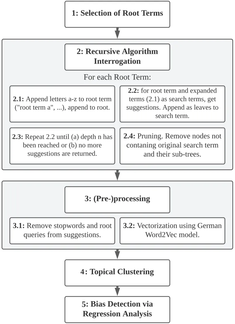 Despite their important role in online information search, search query suggestions have not been researched as much as most other aspects of search engines. Although reasons for this are multi-faceted, the sparseness of context and the limited data basis of up to ten suggestions per search query pose the most significant problem in identifying bias in search query suggestions. The most proven method to reduce sparseness and improve the validity of bias identification of search query suggestions so far is to consider suggestions from subsequent searches over time for the same query. This work presents a new, alternative approach to search query bias identification that includes less high-level suggestions to deepen the data basis of bias analyses. We employ recursive algorithm interrogation techniques and create suggestion trees that enable access to more subliminal search query suggestions. Based on these suggestions, we investigate topical group bias in person-related searches in the political domain.