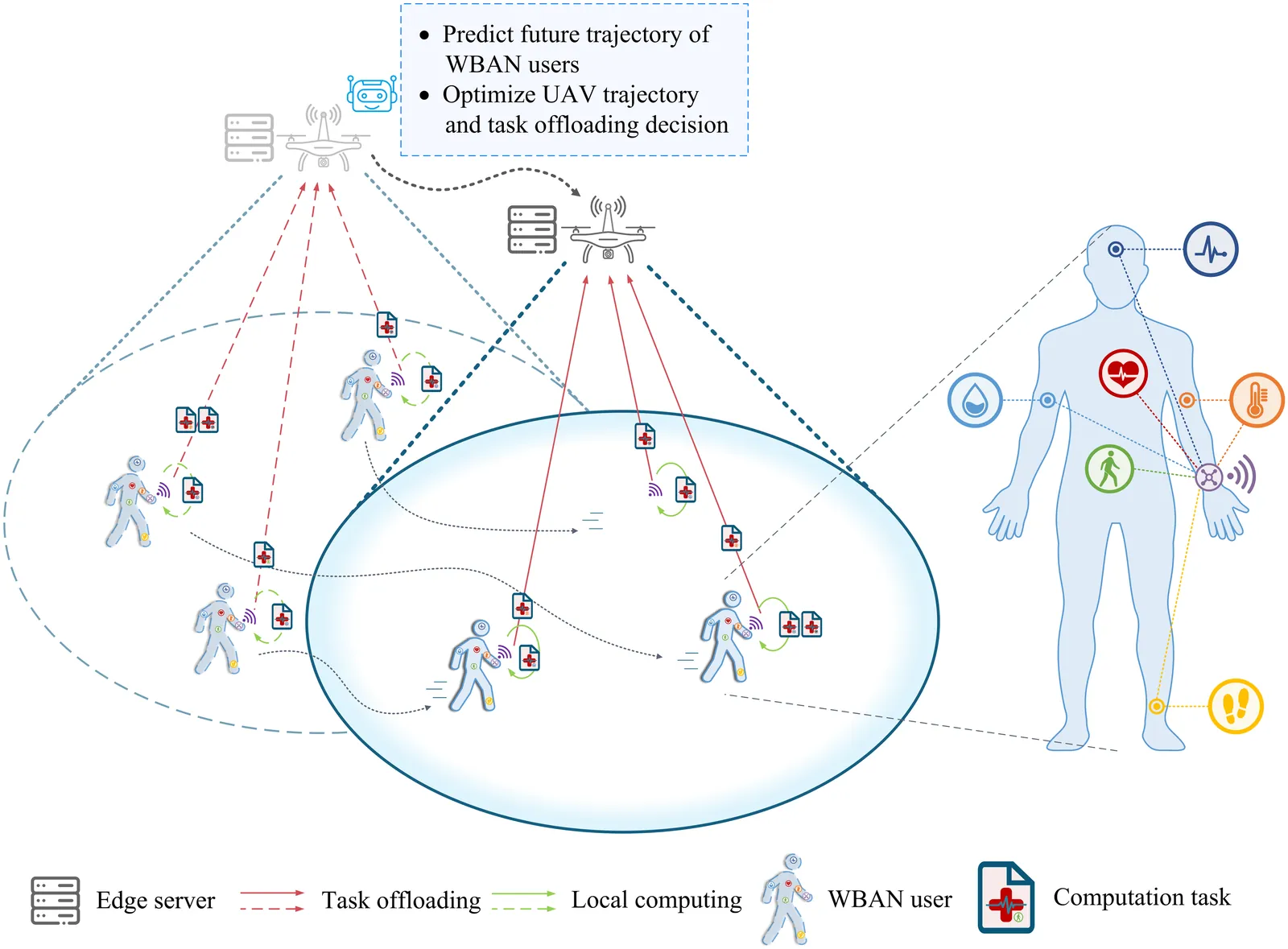Due to their inherent flexibility and autonomous operation, unmanned aerial vehicles (UAVs) have been widely used in Internet of Medical Things (IoMT) to provide real-time biomedical edge computing service for wireless body area network (WBAN) users. In this paper, considering the time-varying task criticality characteristics of diverse WBAN users and the dual mobility between WBAN users and UAV, we investigate the dynamic task offloading and UAV flight trajectory optimization problem to minimize the weighted average task completion time of all the WBAN users, under the constraint of UAV energy consumption. To tackle the problem, an embodied AI-enhanced IoMT edge computing framework is established. Specifically, we propose a novel hierarchical multi-scale Transformer-based user trajectory prediction model based on the users' historical trajectory traces captured by the embodied AI agent (i.e., UAV). Afterwards, a prediction-enhanced deep reinforcement learning (DRL) algorithm that integrates predicted users' mobility information is designed for intelligently optimizing UAV flight trajectory and task offloading decisions. Real-word movement traces and simulation results demonstrate the superiority of the proposed methods in comparison with the existing benchmarks.