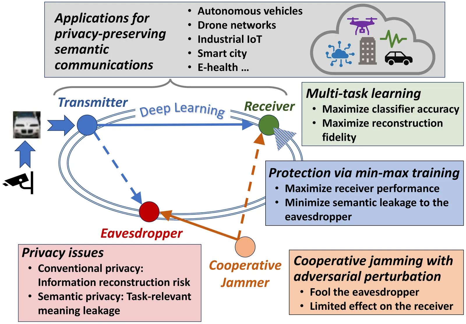 Semantic communications conveys task-relevant meaning rather than focusing solely on message reconstruction, improving bandwidth efficiency and robustness for next-generation wireless systems. However, learned semantic representations can still leak sensitive information to unintended receivers (eavesdroppers). This paper presents a deep learning-based semantic communication framework that jointly supports multiple receiver tasks while explicitly limiting semantic leakage to an eavesdropper. The legitimate link employs a learned encoder at the transmitter, while the receiver trains decoders for semantic inference and data reconstruction. The security problem is formulated via an iterative min-max optimization in which an eavesdropper is trained to improve its semantic inference, while the legitimate transmitter-receiver pair is trained to preserve task performance while reducing the eavesdropper's success. We also introduce an auxiliary layer that superimposes a cooperative, adversarially crafted perturbation on the transmitted waveform to degrade semantic leakage to an eavesdropper. Performance is evaluated over Rayleigh fading channels with additive white Gaussian noise using MNIST and CIFAR-10 datasets. Semantic accuracy and reconstruction quality improve with increasing latent dimension, while the min-max mechanism reduces the eavesdropper's inference performance significantly without degrading the legitimate receiver. The perturbation layer is successful in reducing semantic leakage even when the legitimate link is trained only for its own task. This comprehensive framework motivates semantic communication designs with tunable, end-to-end privacy against adaptive adversaries in realistic wireless settings.