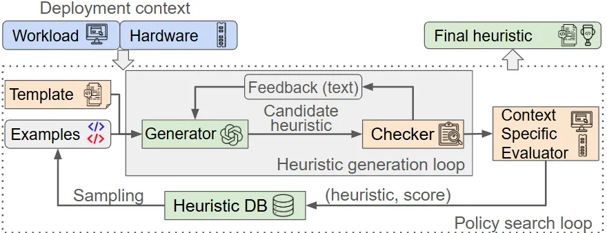 Resource-management tasks in modern operating and distributed systems continue to rely primarily on hand-designed heuristics for tasks such as scheduling, caching, or active queue management. Designing performant heuristics is an expensive, time-consuming process that we are forced to continuously go through due to the constant flux of hardware, workloads and environments. We propose a new alternative: synthesizing instance-optimal heuristics -- specialized for the exact workloads and hardware where they will be deployed -- using code-generating large language models (LLMs). To make this synthesis tractable, Vulcan separates policy and mechanism through LLM-friendly, task-agnostic interfaces. With these interfaces, users specify the inputs and objectives of their desired policy, while Vulcan searches for performant policies via evolutionary search over LLM-generated code. This interface is expressive enough to capture a wide range of system policies, yet sufficiently constrained to allow even small, inexpensive LLMs to generate correct and executable code. We use Vulcan to synthesize performant heuristics for cache eviction and memory tiering, and find that these heuristics outperform all human-designed state-of-the-art algorithms by upto 69% and 7.9% in performance for each of these tasks respectively.