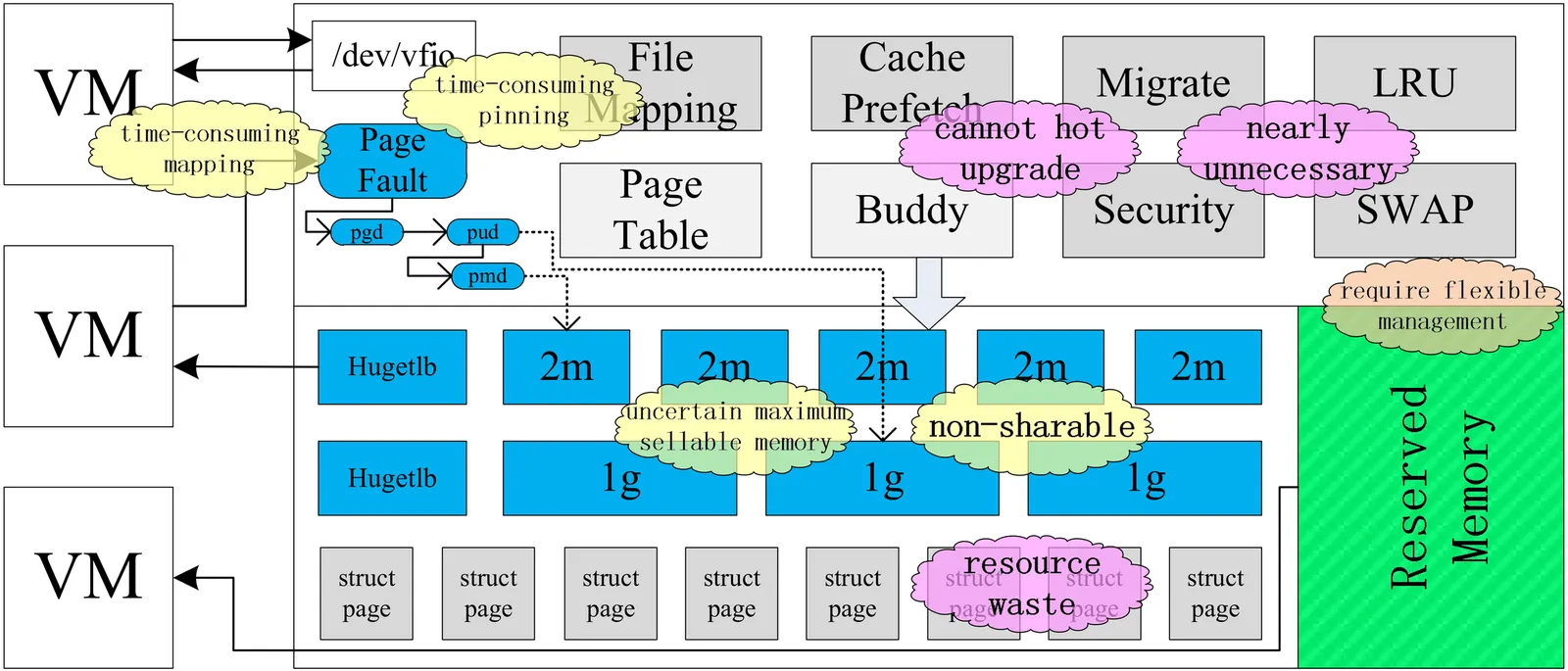 Traditional memory management suffers from metadata overhead, architectural complexity, and stability degradation, problems intensified in cloud environments. Existing software/hardware optimizations are insufficient for cloud computing's dual demands of flexibility and low overhead. This paper presents Vmem, a memory management architecture for in-production cloud environments that enables flexible, efficient cloud server memory utilization through lightweight reserved memory management. Vmem is the first such architecture to support online upgrades, meeting cloud requirements for high stability and rapid iterative evolution. Experiments show Vmem increases sellable memory rate by about 2%, delivers extreme elasticity and performance, achieves over 3x faster boot time for VFIO-based virtual machines (VMs), and improves network performance by about 10% for DPU-accelerated VMs. Vmem has been deployed at large scale for seven years, demonstrating efficiency and stability on over 300,000 cloud servers supporting hundreds of millions of VMs.