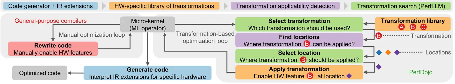 The increasing complexity of machine learning models and the proliferation of diverse hardware architectures (CPUs, GPUs, accelerators) make achieving optimal performance a significant challenge. Heterogeneity in instruction sets, specialized kernel requirements for different data types and model features (e.g., sparsity, quantization), and architecture-specific optimizations complicate performance tuning. Manual optimization is resource-intensive, while existing automatic approaches often rely on complex hardware-specific heuristics and uninterpretable intermediate representations, hindering performance portability. We introduce PerfLLM, a novel automatic optimization methodology leveraging Large Language Models (LLMs) and Reinforcement Learning (RL). Central to this is PerfDojo, an environment framing optimization as an RL game using a human-readable, mathematically-inspired code representation that guarantees semantic validity through transformations. This allows effective optimization without prior hardware knowledge, facilitating both human analysis and RL agent training. We demonstrate PerfLLM's ability to achieve significant performance gains across diverse CPU (x86, Arm, RISC-V) and GPU architectures.