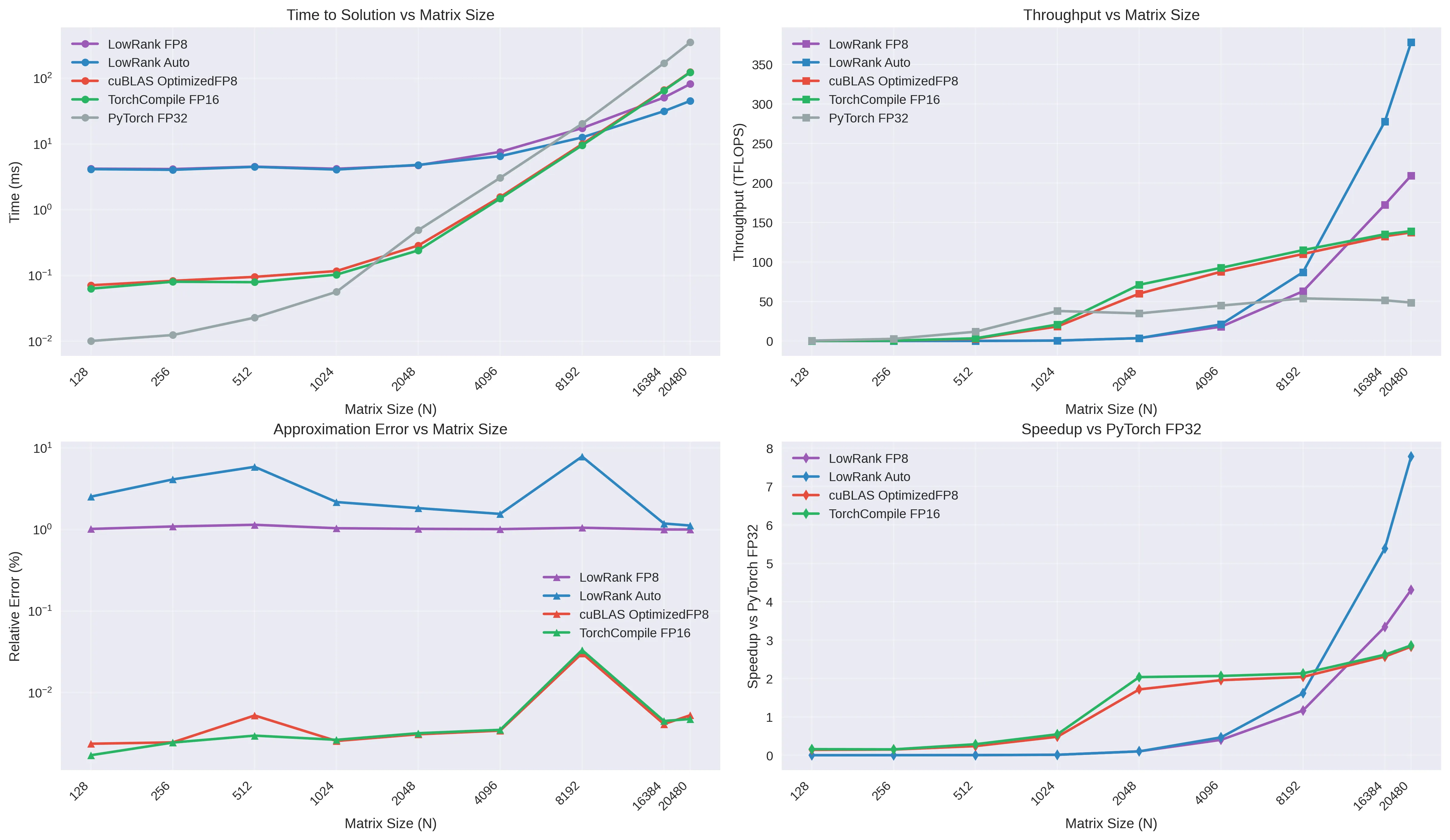 Large matrix multiplication is a cornerstone of modern machine learning workloads, yet traditional approaches suffer from cubic computational complexity (e.g., $\mathcal{O}(n^3)$ for a matrix of size $n\times n$). We present Low-Rank GEMM, a novel approach that leverages low-rank matrix approximations to achieve sub-quadratic complexity while maintaining hardware-accelerated performance through FP8 precision and intelligent kernel selection. On a NVIDIA RTX 4090, our implementation achieves up to 378 TFLOPS on matrices up to $N=20480$, providing 75\% memory savings and $7.8\times$ speedup over PyTorch FP32 for large matrices. The system automatically adapts to hardware capabilities, selecting optimal decomposition methods (SVD, randomized SVD) and precision levels based on matrix characteristics and available accelerators. Comprehensive benchmarking on NVIDIA RTX 4090 demonstrates that Low-Rank GEMM becomes the fastest approach for matrices $N\geq10240$, surpassing traditional cuBLAS implementations through memory bandwidth optimization rather than computational shortcuts.