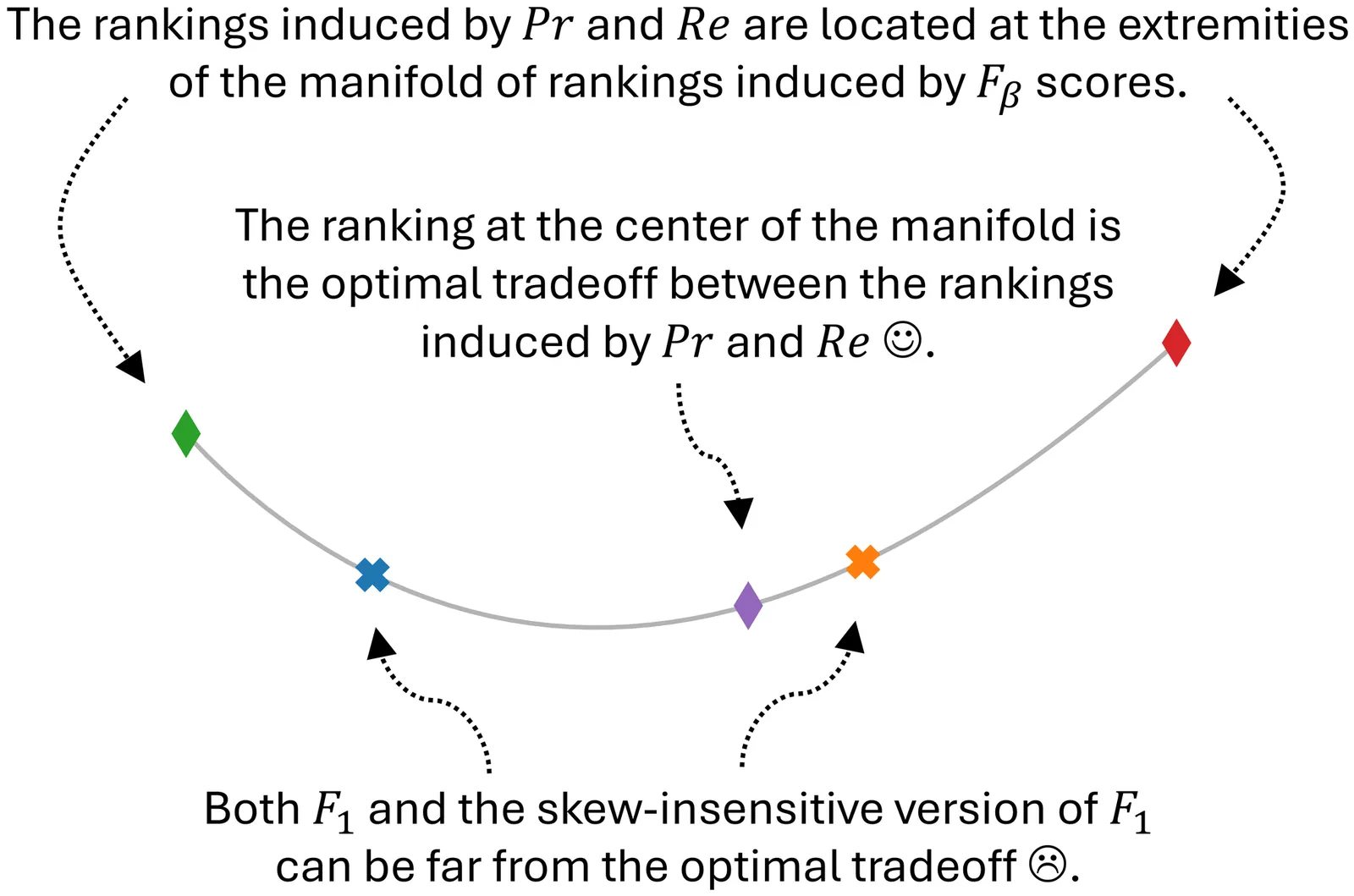 Ranking methods or models based on their performance is of prime importance but is tricky because performance is fundamentally multidimensional. In the case of classification, precision and recall are scores with probabilistic interpretations that are both important to consider and complementary. The rankings induced by these two scores are often in partial contradiction. In practice, therefore, it is extremely useful to establish a compromise between the two views to obtain a single, global ranking. Over the last fifty years or so,it has been proposed to take a weighted harmonic mean, known as the F-score, F-measure, or $F_β$. Generally speaking, by averaging basic scores, we obtain a score that is intermediate in terms of values. However, there is no guarantee that these scores lead to meaningful rankings and no guarantee that the rankings are good tradeoffs between these base scores. Given the ubiquity of $F_β$ scores in the literature, some clarification is in order. Concretely: (1) We establish that $F_β$-induced rankings are meaningful and define a shortest path between precision- and recall-induced rankings. (2) We frame the problem of finding a tradeoff between two scores as an optimization problem expressed with Kendall rank correlations. We show that $F_1$ and its skew-insensitive version are far from being optimal in that regard. (3) We provide theoretical tools and a closed-form expression to find the optimal value for $β$ for any distribution or set of performances, and we illustrate their use on six case studies.