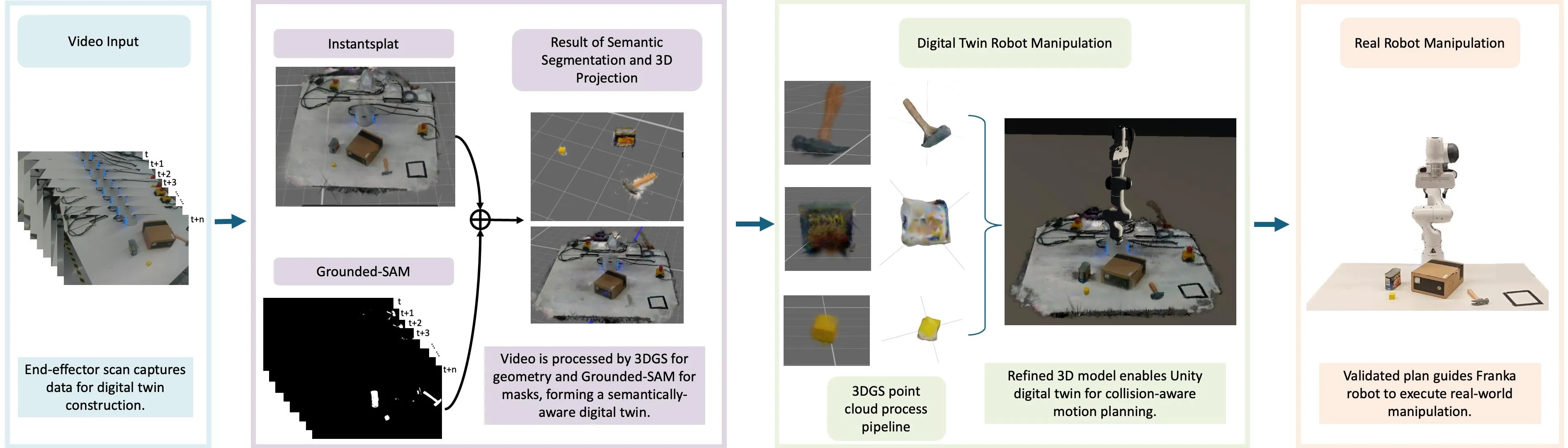 Developing high-fidelity, interactive digital twins is crucial for enabling closed-loop motion planning and reliable real-world robot execution, which are essential to advancing sim-to-real transfer. However, existing approaches often suffer from slow reconstruction, limited visual fidelity, and difficulties in converting photorealistic models into planning-ready collision geometry. We present a practical framework that constructs high-quality digital twins within minutes from sparse RGB inputs. Our system employs 3D Gaussian Splatting (3DGS) for fast, photorealistic reconstruction as a unified scene representation. We enhance 3DGS with visibility-aware semantic fusion for accurate 3D labelling and introduce an efficient, filter-based geometry conversion method to produce collision-ready models seamlessly integrated with a Unity-ROS2-MoveIt physics engine. In experiments with a Franka Emika Panda robot performing pick-and-place tasks, we demonstrate that this enhanced geometric accuracy effectively supports robust manipulation in real-world trials. These results demonstrate that 3DGS-based digital twins, enriched with semantic and geometric consistency, offer a fast, reliable, and scalable path from perception to manipulation in unstructured environments.