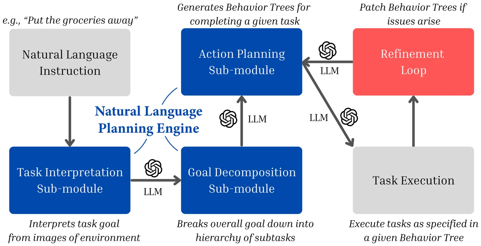 In this work, we introduce and formalize the Zero-Knowledge Task Planning (ZKTP) problem, i.e., formulating a sequence of actions to achieve some goal without task-specific knowledge. Additionally, we present a first investigation and approach for ZKTP that leverages a large language model (LLM) to decompose natural language instructions into subtasks and generate behavior trees (BTs) for execution. If errors arise during task execution, the approach also uses an LLM to adjust the BTs on-the-fly in a refinement loop. Experimental validation in the AI2-THOR simulator demonstrate our approach's effectiveness in improving overall task performance compared to alternative approaches that leverage task-specific knowledge. Our work demonstrates the potential of LLMs to effectively address several aspects of the ZKTP problem, providing a robust framework for automated behavior generation with no task-specific setup.