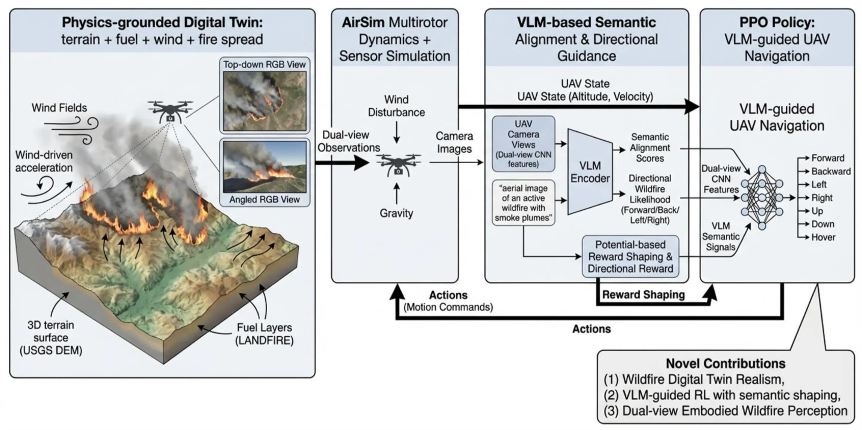 Wildfire monitoring demands autonomous systems capable of reasoning under extreme visual degradation, rapidly evolving physical dynamics, and scarce real-world training data. Existing UAV navigation approaches rely on simplified simulators and supervised perception pipelines, and lack embodied agents interacting with physically realistic fire environments. We introduce FIRE-VLM, the first end-to-end vision-language model (VLM) guided reinforcement learning (RL) framework trained entirely within a high-fidelity, physics-grounded wildfire digital twin. Built from USGS Digital Elevation Model (DEM) terrain, LANDFIRE fuel inventories, and semi-physical fire-spread solvers, this twin captures terrain-induced runs, wind-driven acceleration, smoke plume occlusion, and dynamic fuel consumption. Within this environment, a PPO agent with dual-view UAV sensing is guided by a CLIP-style VLM. Wildfire-specific semantic alignment scores, derived from a single prompt describing active fire and smoke plumes, are integrated as potential-based reward shaping signals. Our contributions are: (1) a GIS-to-simulation pipeline for constructing wildfire digital twins; (2) a VLM-guided RL agent for UAV firefront tracking; and (3) a wildfire-aware reward design that combines physical terms with VLM semantics. Across five digital-twin evaluation tasks, our VLM-guided policy reduces time-to-detection by up to 6 times, increases time-in-FOV, and is, to our knowledge, the first RL-based UAV wildfire monitoring system demonstrated in kilometer-scale, physics-grounded digital-twin fires.