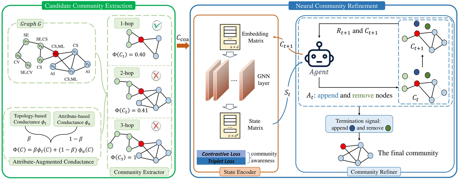 Community search aims to identify a refined set of nodes that are most relevant to a given query, supporting tasks ranging from fraud detection to recommendation. Unlike homophilic graphs, many real-world networks are heterophilic, where edges predominantly connect dissimilar nodes. Therefore, structural signals that once reflected smooth, low-frequency similarity now appear as sharp, high-frequency contrasts. However, both classical algorithms (e.g., k-core, k-truss) and recent ML-based models struggle to achieve effective community search on heterophilic graphs, where edge signs or semantics are generally unknown. Algorithm-based methods often return communities with mixed class labels, while GNNs, built on homophily, smooth away meaningful signals and blur community boundaries. Therefore, we propose Adaptive Community Search (AdaptCS), a unified framework featuring three key designs: (i) an AdaptCS Encoder that disentangles multi-hop and multi-frequency signals, enabling the model to capture both smooth (homophilic) and contrastive (heterophilic) relations; (ii) a memory-efficient low-rank optimization that removes the main computational bottleneck and ensures model scalability; and (iii) an Adaptive Community Score (ACS) that guides online search by balancing embedding similarity and topological relations. Extensive experiments on both heterophilic and homophilic benchmarks demonstrate that AdaptCS outperforms the best-performing baseline by an average of 11% in F1-score, retains robustness across heterophily levels, and achieves up to 2 orders of magnitude speedup.