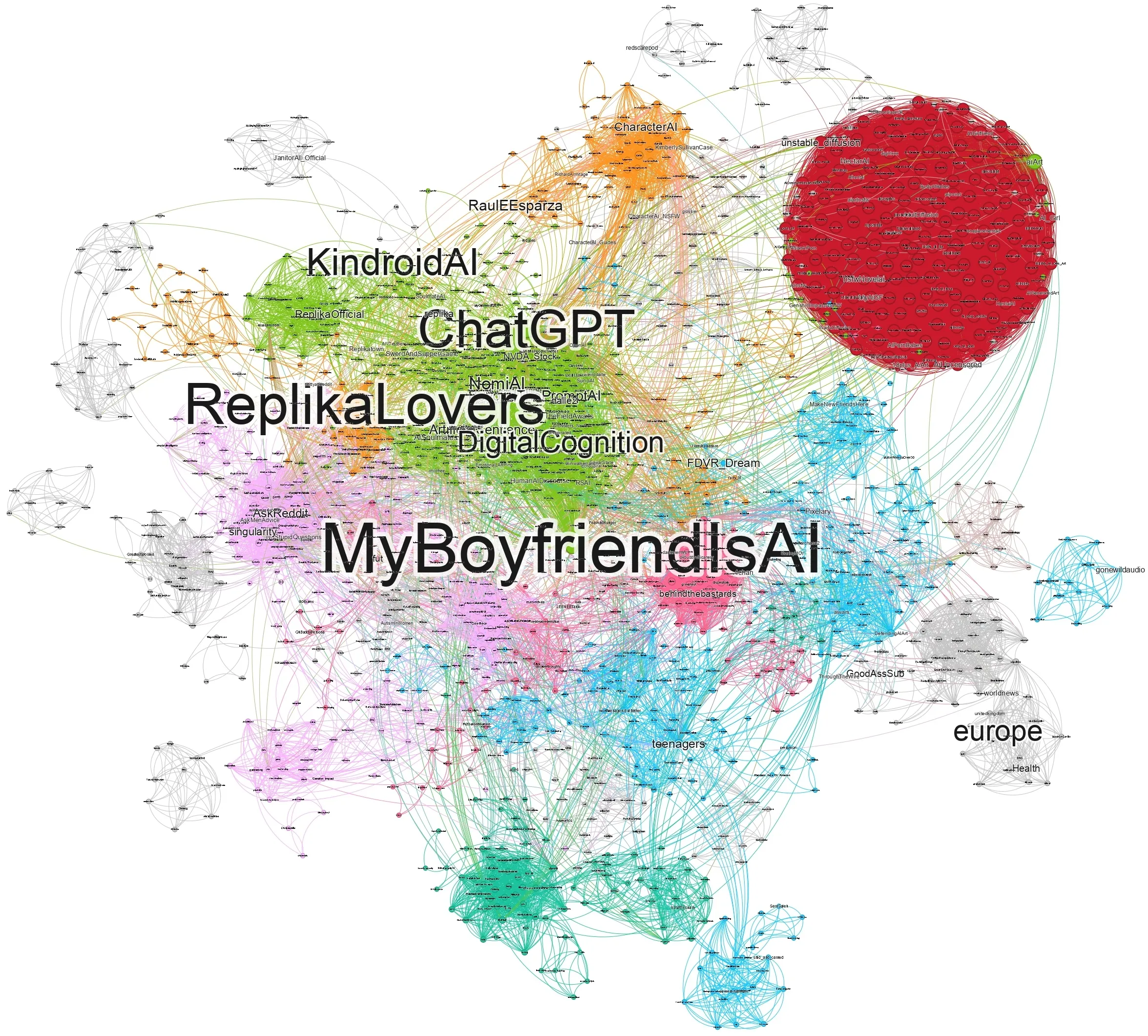 AI-companionship platforms are rapidly reshaping how people form emotional, romantic, and parasocial bonds with non-human agents, raising new questions about how these relationships intersect with gendered online behavior and exposure to harmful content. Focusing on the MyBoyfriendIsAI (MBIA) subreddit, we reconstruct the Reddit activity histories of more than 3,000 highly engaged users over two years, yielding over 67,000 historical submissions. We then situate MBIA within a broader ecosystem by building a historical interaction network spanning more than 2,000 subreddits, which enables us to trace cross-community pathways and measure how toxicity and emotional expression vary across these trajectories. We find that MBIA users primarily traverse four surrounding community spheres (AI-companionship, porn-related, forum-like, and gaming) and that participation across the ecosystem exhibits a distinct gendered structure, with substantial engagement by female users. While toxicity is generally low across most pathways, we observe localized spikes concentrated in a small subset of AI-porn and gender-oriented communities. Nearly 16% of users engage with gender-focused subreddits, and their trajectories display systematically different patterns of emotional expression and elevated toxicity, suggesting that a minority of gendered pathways may act as toxicity amplifiers within the broader AI-companionship ecosystem. These results characterize the gendered structure of cross-community participation around AI companionship on Reddit and highlight where risks concentrate, informing measurement, moderation, and design practices for human-AI relationship platforms.