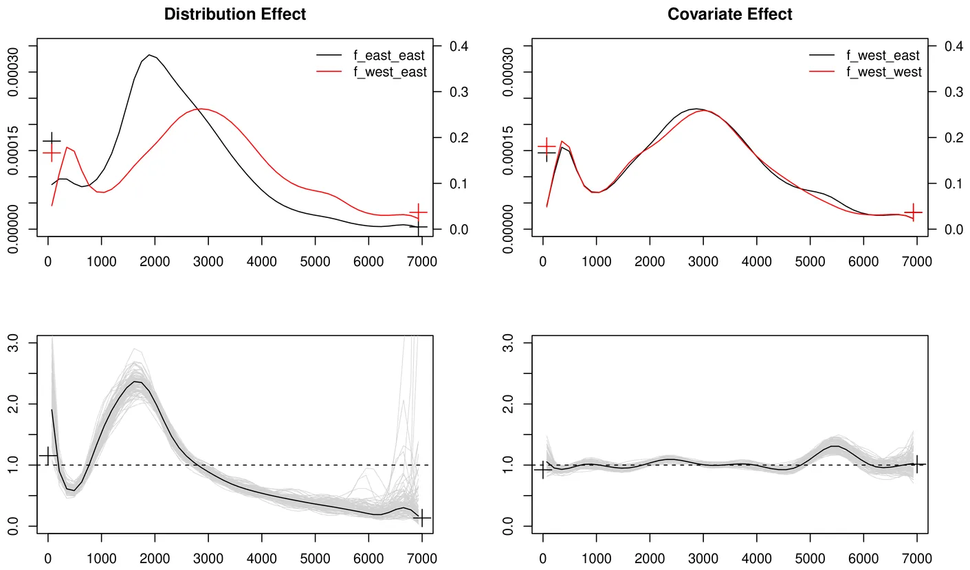 We propose a novel framework for conducting causal inference based on counterfactual densities. While the current paradigm of causal inference is mostly focused on estimating average treatment effects (ATEs), which restricts the analysis to the first moment of the outcome variable, our density-based approach is able to detect causal effects based on general distributional characteristics. Following the Oaxaca-Blinder decomposition approach, we consider two types of counterfactual density effects that together explain observed discrepancies between the densities of the treated and control group. First, the distribution effect is the counterfactual effect of changing the conditional density of the control group to that of the treatment group, while keeping the covariates fixed at the treatment group distribution. Second, the covariate effect represents the effect of a hypothetical change in the covariate distribution. Both effects have a causal interpretation under the classical unconfoundedness and overlap assumptions. Methodologically, our approach is based on analyzing the conditional densities as elements of a Bayes Hilbert space, which preserves the non-negativity and integration-to-one constraints. We specify a flexible functional additive regression model estimating the conditional densities. We apply our method to analyze the German East--West income gap, i.e., the observed differences in wages between East Germans and West Germans. While most of the existing studies focus on the average differences and neglect other distributional characteristics, our density-based approach is suited to detect all nuances of the counterfactual distributions, including differences in probability masses at zero.