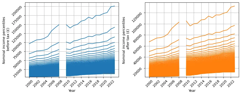 We analyse the UK income distribution from 2000 to 2023 using HMRC annual percentile data for both pre-tax and post-tax income. We fit a prefactor-adjusted $κ$-generalised specification to the data by weighted non-linear least squares and use inverse transform sampling to generate simulated income populations. The results suggest a redistribution of income shares over the period: the bottom 40\% appears to have increased its share, the middle-upper part of the distribution (50th--90th percentiles) lost share, the top 10\% remained broadly stable, and the top 1\% increased its share of pre-tax income. Because the modified specification is defined only above a positive threshold, conclusions concerning the lower tail should be interpreted with some caution. Using simulated 2023 pre-tax incomes to examine tax reform scenarios, we find that revenue-equivalent tax increases on high-income earners must be more than four times as large as comparable increases on lower-income earners. This suggests that, despite increased concentration at the top, the UK tax base remains driven primarily by the large number of taxpayers outside the very top of the distribution.