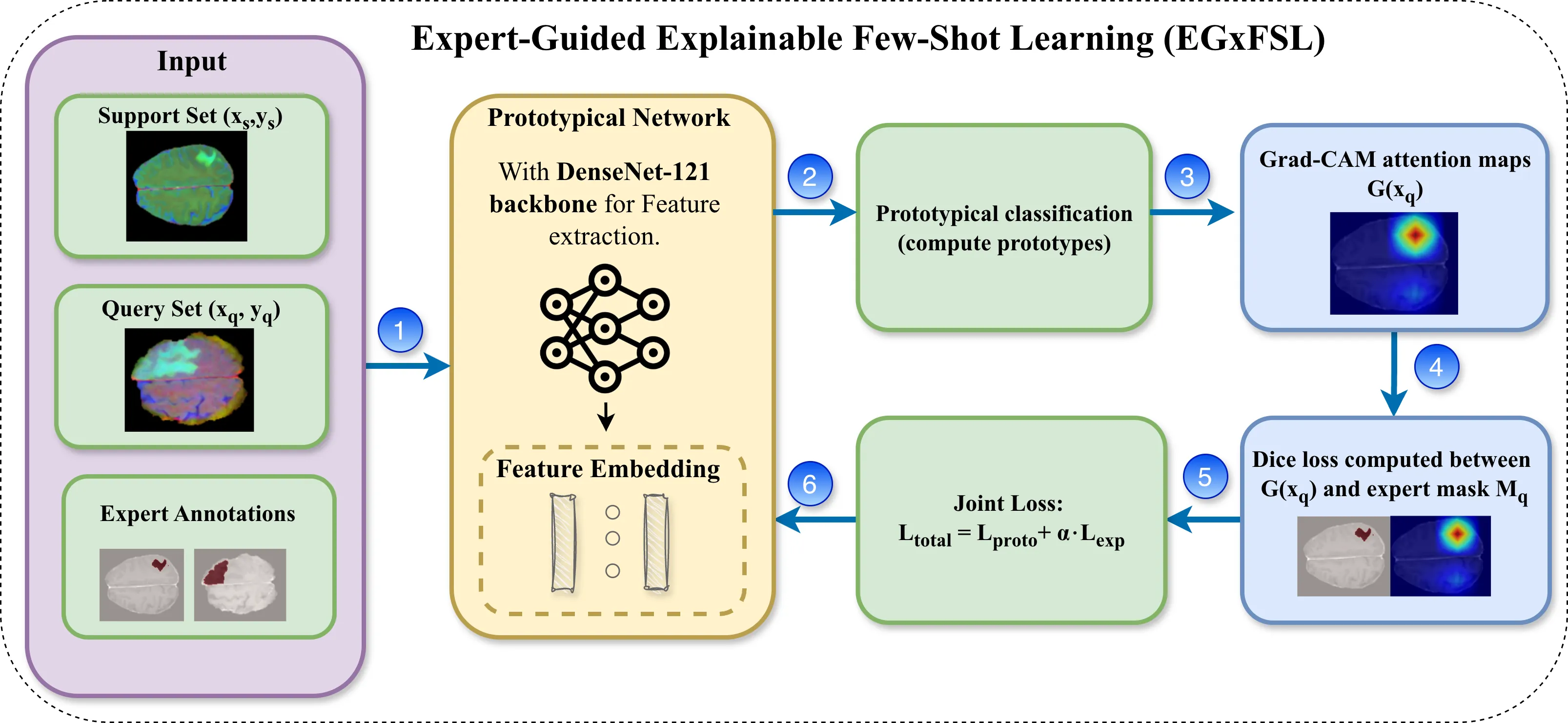 Medical image analysis faces two critical challenges: scarcity of labeled data and lack of model interpretability, both hindering clinical AI deployment. Few-shot learning (FSL) addresses data limitations but lacks transparency in predictions. Active learning (AL) methods optimize data acquisition but overlook interpretability of acquired samples. We propose a dual-framework solution: Expert-Guided Explainable Few-Shot Learning (EGxFSL) and Explainability-Guided AL (xGAL). EGxFSL integrates radiologist-defined regions-of-interest as spatial supervision via Grad-CAM-based Dice loss, jointly optimized with prototypical classification for interpretable few-shot learning. xGAL introduces iterative sample acquisition prioritizing both predictive uncertainty and attention misalignment, creating a closed-loop framework where explainability guides training and sample selection synergistically. On the BraTS (MRI), VinDr-CXR (chest X-ray), and SIIM-COVID-19 (chest X-ray) datasets, we achieve accuracies of 92\%, 76\%, and 62\%, respectively, consistently outperforming non-guided baselines across all datasets. Under severe data constraints, xGAL achieves 76\% accuracy with only 680 samples versus 57\% for random sampling. Grad-CAM visualizations demonstrate guided models focus on diagnostically relevant regions, with generalization validated on breast ultrasound confirming cross-modality applicability.
