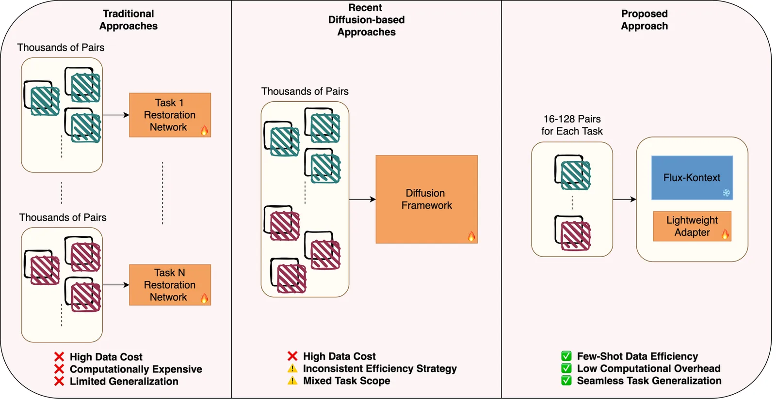 Image restoration has traditionally required training specialized models on thousands of paired examples per degradation type. We challenge this paradigm by demonstrating that powerful pre-trained text-conditioned image editing models can be efficiently adapted for multiple restoration tasks through parameter-efficient fine-tuning with remarkably few examples. Our approach fine-tunes LoRA adapters on FLUX.1 Kontext, a state-of-the-art 12B parameter flow matching model for image-to-image translation, using only 16-128 paired images per task, guided by simple text prompts that specify the restoration operation. Unlike existing methods that train specialized restoration networks from scratch with thousands of samples, we leverage the rich visual priors already encoded in large-scale pre-trained editing models, dramatically reducing data requirements while maintaining high perceptual quality. A single unified LoRA adapter, conditioned on task-specific text prompts, effectively handles multiple degradations including denoising, deraining, and dehazing. Through comprehensive ablation studies, we analyze: (i) the impact of training set size on restoration quality, (ii) trade-offs between task-specific versus unified multi-task adapters, (iii) the role of text encoder fine-tuning, and (iv) zero-shot baseline performance. While our method prioritizes perceptual quality over pixel-perfect reconstruction metrics like PSNR/SSIM, our results demonstrate that pre-trained image editing models, when properly adapted, offer a compelling and data-efficient alternative to traditional image restoration approaches, opening new avenues for few-shot, prompt-guided image enhancement. The code to reproduce our results are available at: https://github.com/makinyilmaz/Edit2Restore
