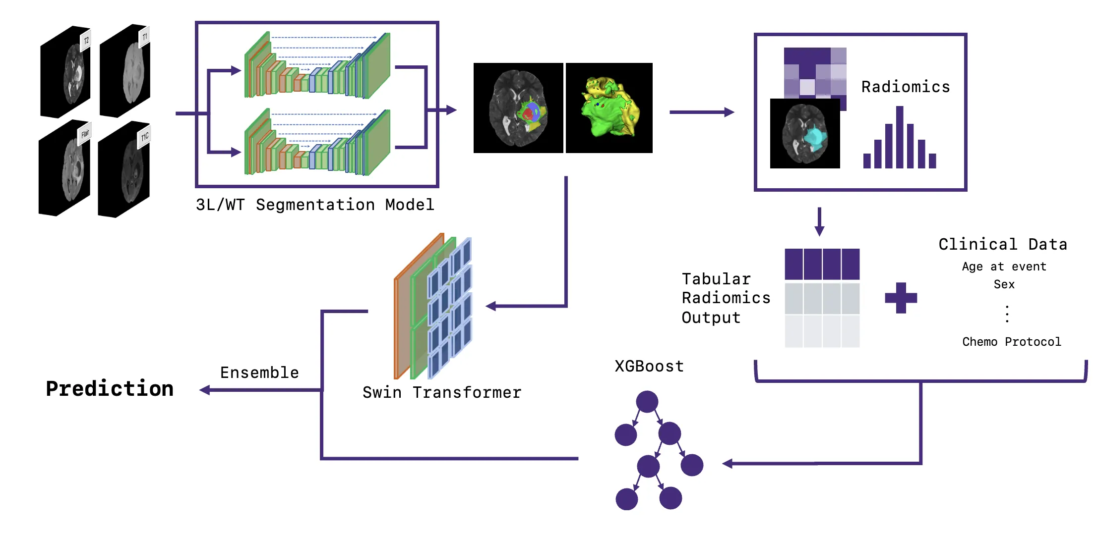 In this paper, we introduce a novel pipeline for predicting chemotherapy response in pediatric brain tumors that are not amenable to complete surgical resection, using pre-treatment magnetic resonance imaging combined with clinical information. Our method integrates a state-of-the-art pediatric brain tumor segmentation framework with radiomic feature extraction and clinical data through an ensemble of a Swin UNETR encoder and XGBoost classifier. The segmentation model delineates four tumor subregions enhancing tumor, non-enhancing tumor, cystic component and edema which are used to extract imaging biomarkers and generate predictive features. The Swin UNETR network classifies the response to treatment directly from these segmented MRI scans, while XGBoost predicts response using radiomics and clinical variables including legal sex, ethnicity, race, age at event (in days), molecular subtype, tumor locations, initial surgery status, metastatic status, metastasis location, chemotherapy type, protocol name and chemotherapy agents. The ensemble output provides a non-invasive estimate of chemotherapy response in this historically challenging population characterized by lower progression-free survival. Among compared approaches, our Swin-Ensemble achieved the best performance (precision for non effective cases=0.68, recall for non effective cases=0.85, precision for chemotherapy effective cases=0.64 and overall accuracy=0.69), outperforming Mamba-FeatureFuse, Swin UNETR encoder, and Swin-FeatureFuse models. Our findings suggest that this ensemble framework represents a promising step toward personalized therapy response prediction for pediatric low-grade glioma patients in need of chemotherapy treatment who are not suitable for complete surgical resection, a population with significantly lower progression free survival and for whom chemotherapy remains the primary treatment option.
