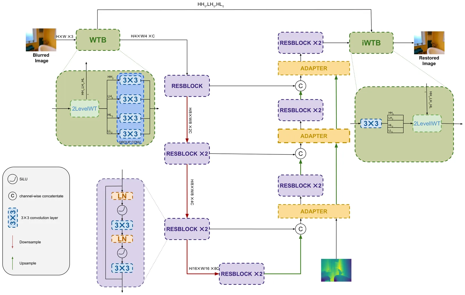 Image deblurring is a challenging problem in imaging due to its highly ill-posed nature. Deep learning models have shown great success in tackling this problem but the quest for the best image quality has brought their computational complexity up, making them impractical on anything but powerful servers. Meanwhile, recent works have shown that mobile Lidars can provide complementary information in the form of depth maps that enhance deblurring quality. In this paper, we introduce a novel low-complexity neural network for depth-guided image deblurring. We show that the use of the wavelet transform to separate structural details and reduce spatial redundancy as well as efficient feature conditioning on the depth information are essential ingredients in developing a low-complexity model. Experimental results show competitive image quality against recent state-of-the-art models while reducing complexity by up to two orders of magnitude.