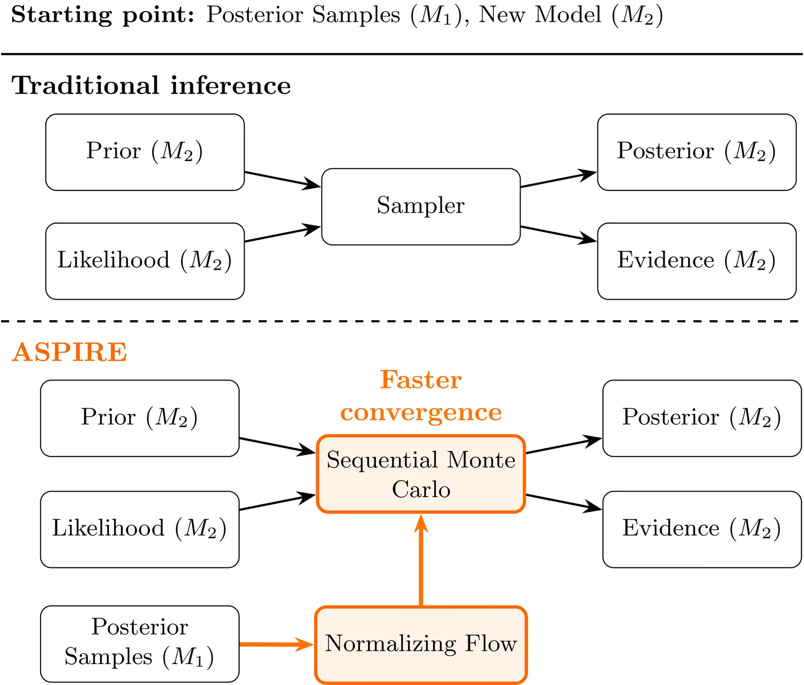 We introduce Accelerated Sequential Posterior Inference via Reuse (ASPIRE), a broadly applicable framework that transforms existing posterior samples and Bayesian evidence estimates into unbiased results under alternative models without rerunning the original analysis. ASPIRE combines normalizing flows with a generalized Sequential Monte Carlo scheme, enabling efficient updates of existing results and reducing the computational cost of reanalyses by 4-10 times. This addresses a growing problem in gravitational-wave astronomy, where events must be repeatedly reanalyzed under different models or physical hypotheses. We show that ASPIRE reproduces full Bayesian results when switching waveform models or adding physical effects such as spin precession and orbital eccentricity. With this statistical robustness, ASPIRE turns repeated reanalyses into fast, reliable updatespaving the way for systematic studies of waveform systematics, scalable reanalyses across large event catalogs, and broadly applicable Bayesian reanalysis across other scientific domains.