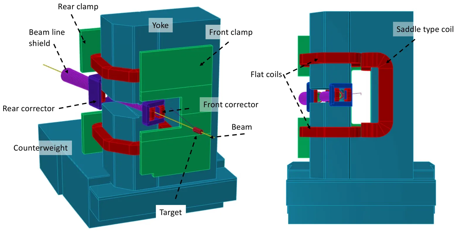 A large solid angle magnetic spectrometer for high luminosity and forward scattering angles was constructed at the Thomas Jefferson National Accelerator Facility. A number of physics experiments have used this spectrometer, and a significant physics program of future experiments has already been approved. A key feature of the spectrometer concept is a horizontal slit opening that allows the beamline to pass through the yoke of the spectrometer magnet. This design enables a short distance between the target and spectrometer, resulting in a 70~msr solid angle acceptance. The residual magnetic-field on the beamline inside the slit is reduced by a two-layer magnetic shielding system, with the external layer comprising a set of iron rings. Two correcting magnets, before and after the dipole, were used to compensate for the transverse component of the fringe field outside of the dipole yoke. The mechanical stability of the tall dipole magnet in close proximity to the target was provided by means of a heavy counterweight.