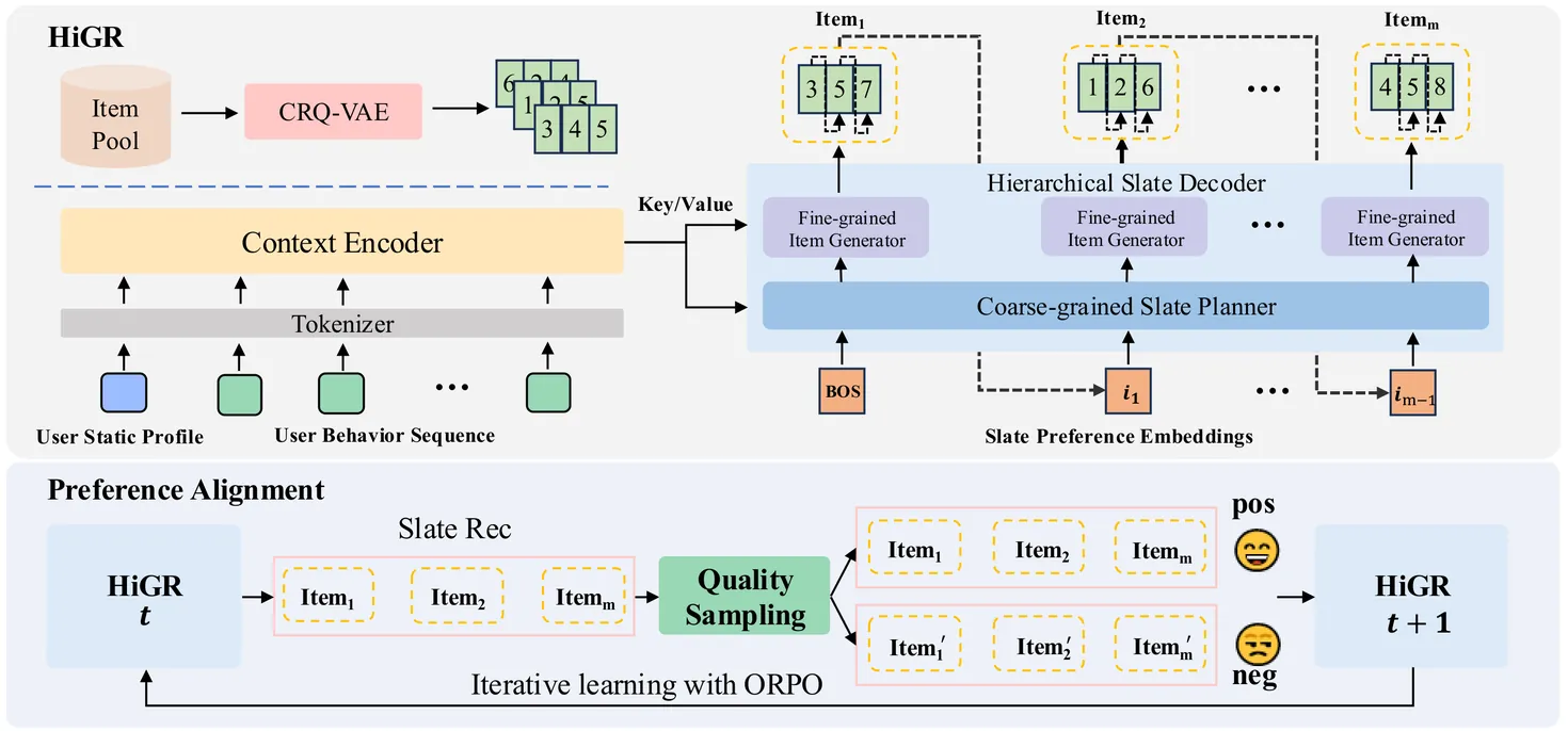 Slate recommendation, where users are presented with a ranked list of items simultaneously, is widely adopted in online platforms. Recent advances in generative models have shown promise in slate recommendation by modeling sequences of discrete semantic IDs autoregressively. However, existing autoregressive approaches suffer from semantically entangled item tokenization and inefficient sequential decoding that lacks holistic slate planning. To address these limitations, we propose HiGR, an efficient generative slate recommendation framework that integrates hierarchical planning with listwise preference alignment. First, we propose an auto-encoder utilizing residual quantization and contrastive constraints to tokenize items into semantically structured IDs for controllable generation. Second, HiGR decouples generation into a list-level planning stage for global slate intent, followed by an item-level decoding stage for specific item selection. Third, we introduce a listwise preference alignment objective to directly optimize slate quality using implicit user feedback. Experiments on our large-scale commercial media platform demonstrate that HiGR delivers consistent improvements in both offline evaluations and online deployment. Specifically, it outperforms state-of-the-art methods by over 10% in offline recommendation quality with a 5x inference speedup, while further achieving a 1.22% and 1.73% increase in Average Watch Time and Average Video Views in online A/B tests.
