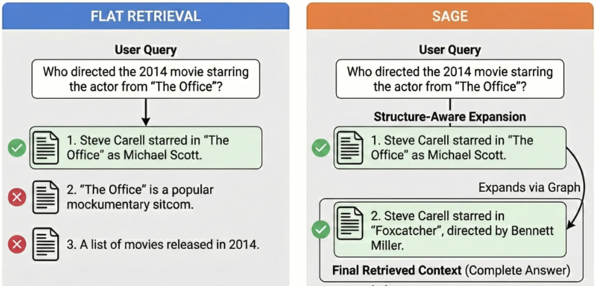 Retrieval-augmented question answering over heterogeneous corpora requires connected evidence across text, tables, and graph nodes. While entity-level knowledge graphs support structured access, they are costly to construct and maintain, and inefficient to traverse at query time. In contrast, standard retriever-reader pipelines use flat similarity search over independently chunked text, missing multi-hop evidence chains across modalities. We propose SAGE (Structure Aware Graph Expansion) framework that (i) constructs a chunk-level graph offline using metadata-driven similarities with percentile-based pruning, and (ii) performs online retrieval by running an initial baseline retriever to obtain k seed chunks, expanding first-hop neighbors, and then filtering the neighbors using dense+sparse retrieval, selecting k' additional chunks. We instantiate the initial retriever using hybrid dense+sparse retrieval for implicit cross-modal corpora and SPARK (Structure Aware Planning Agent for Retrieval over Knowledge Graphs) an agentic retriever for explicit schema graphs. On OTT-QA and STaRK, SAGE improves retrieval recall by 5.7 and 8.5 points over baselines.