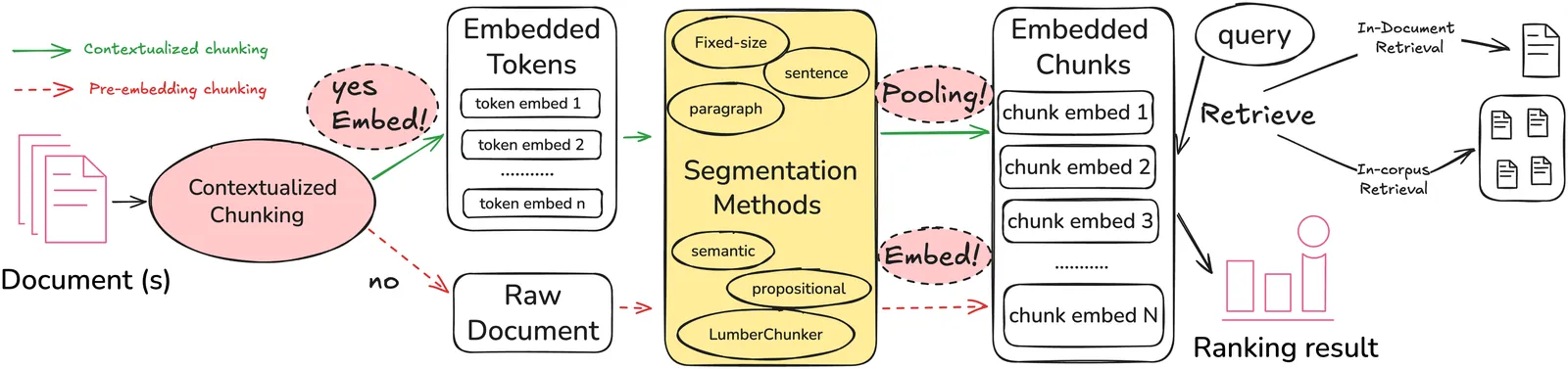 Document chunking is a critical preprocessing step in dense retrieval systems, yet the design space of chunking strategies remains poorly understood. Recent research has proposed several concurrent approaches, including LLM-guided methods (e.g., DenseX and LumberChunker) and contextualized strategies(e.g., Late Chunking), which generate embeddings before segmentation to preserve contextual information. However, these methods emerged independently and were evaluated on benchmarks with minimal overlap, making direct comparisons difficult. This paper reproduces prior studies in document chunking and presents a systematic framework that unifies existing strategies along two key dimensions: (1) segmentation methods, including structure-based methods (fixed-size, sentence-based, and paragraph-based) as well as semantically-informed and LLM-guided methods; and (2) embedding paradigms, which determine the timing of chunking relative to embedding (pre-embedding chunking vs. contextualized chunking). Our reproduction evaluates these approaches in two distinct retrieval settings established in previous work: in-document retrieval (needle-in-a-haystack) and in-corpus retrieval (the standard information retrieval task). Our comprehensive evaluation reveals that optimal chunking strategies are task-dependent: simple structure-based methods outperform LLM-guided alternatives for in-corpus retrieval, while LumberChunker performs best for in-document retrieval. Contextualized chunking improves in-corpus effectiveness but degrades in-document retrieval. We also find that chunk size correlates moderately with in-document but weakly with in-corpus effectiveness, suggesting segmentation method differences are not purely driven by chunk size. Our code and evaluation benchmarks are publicly available at (Anonymoused).