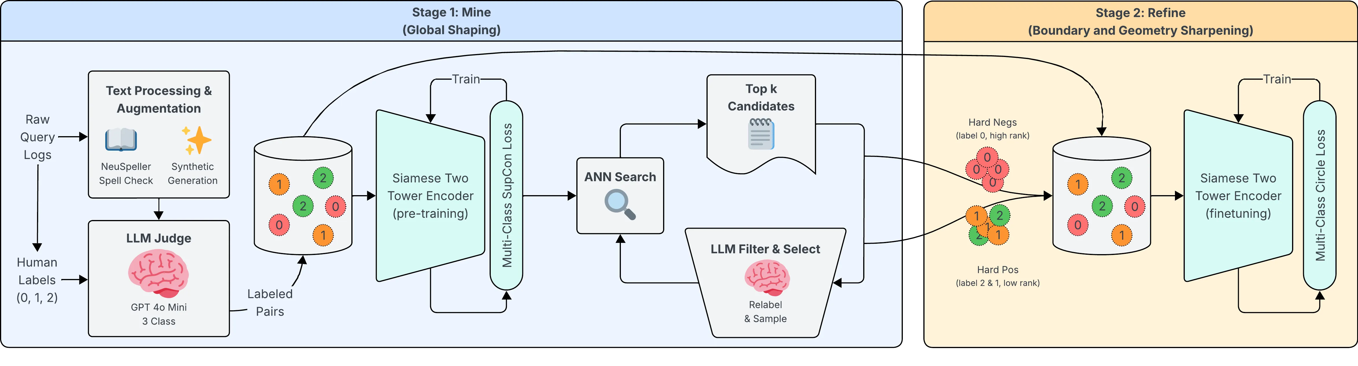 We propose a two-stage "Mine and Refine" contrastive training framework for semantic text embeddings to enhance multi-category e-commerce search retrieval. Large scale e-commerce search demands embeddings that generalize to long tail, noisy queries while adhering to scalable supervision compatible with product and policy constraints. A practical challenge is that relevance is often graded: users accept substitutes or complements beyond exact matches, and production systems benefit from clear separation of similarity scores across these relevance strata for stable hybrid blending and thresholding. To obtain scalable policy consistent supervision, we fine-tune a lightweight LLM on human annotations under a three-level relevance guideline and further reduce residual noise via engagement driven auditing. In Stage 1, we train a multilingual Siamese two-tower retriever with a label aware supervised contrastive objective that shapes a robust global semantic space. In Stage 2, we mine hard samples via ANN and re-annotate them with the policy aligned LLM, and introduce a multi-class extension of circle loss that explicitly sharpens similarity boundaries between relevance levels, to further refine and enrich the embedding space. Robustness is additionally improved through additive spelling augmentation and synthetic query generation. Extensive offline evaluations and production A/B tests show that our framework improves retrieval relevance and delivers statistically significant gains in engagement and business impact.