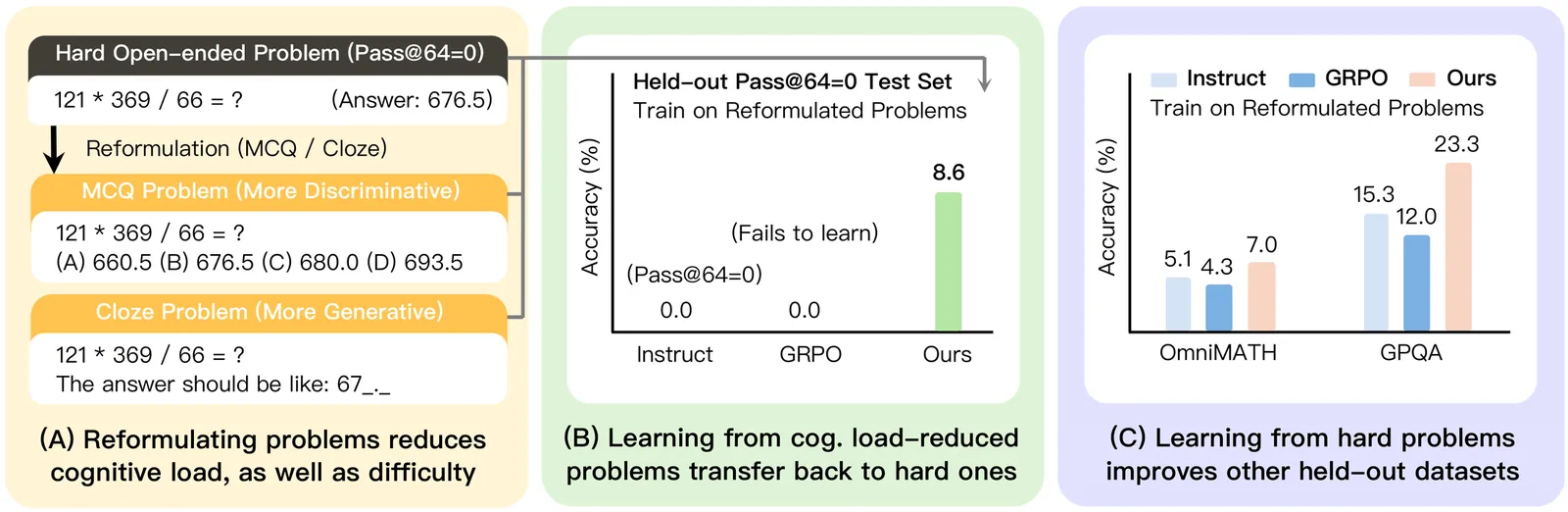 Reinforcement learning from verifiable rewards (RLVR) has improved the reasoning abilities of LLMs, yet a fundamental limitation remains: models cannot learn from problems that are too difficult to solve under their current policy, as these yield no meaningful reward signal. We propose a simple yet effective solution based on task reformulation. We transform challenging open-ended problems into cognitively simpler variants -- such as multiple-choice and cloze formats -- that preserve the original answer while reducing the effective search space and providing denser learning signals. These reformulations span a spectrum from discriminative to generative tasks, which we exploit to bootstrap learning: models first learn from structured, easier formats, and this knowledge transfers back to improve performance on the original open-ended problems. Building on this insight, we introduce Cog-DRIFT, a framework that constructs reformulated variants and organizes them into an adaptive curriculum based on difficulty. Training progresses from easier to harder formats, enabling the model to learn from problems that previously yielded zero signal under standard RL post-training. Cog-DRIFT not only improves on the originally unsolvable hard problems (absolute +10.11% for Qwen and +8.64% for Llama) but also generalizes well to other held-out datasets. Across 2 models and 6 reasoning benchmarks, our method consistently outperforms standard GRPO and strong guided-exploration baselines. On average, Cog-DRIFT shows +4.72% (Qwen) and +3.23% (Llama) improvements over the second-best baseline. We further show that Cog-DRIFT improves pass@k at test time, and the curriculum improves sample efficiency. Overall, our results highlight task reformulation and curriculum learning as an effective paradigm for overcoming the exploration barrier in LLM post-training.