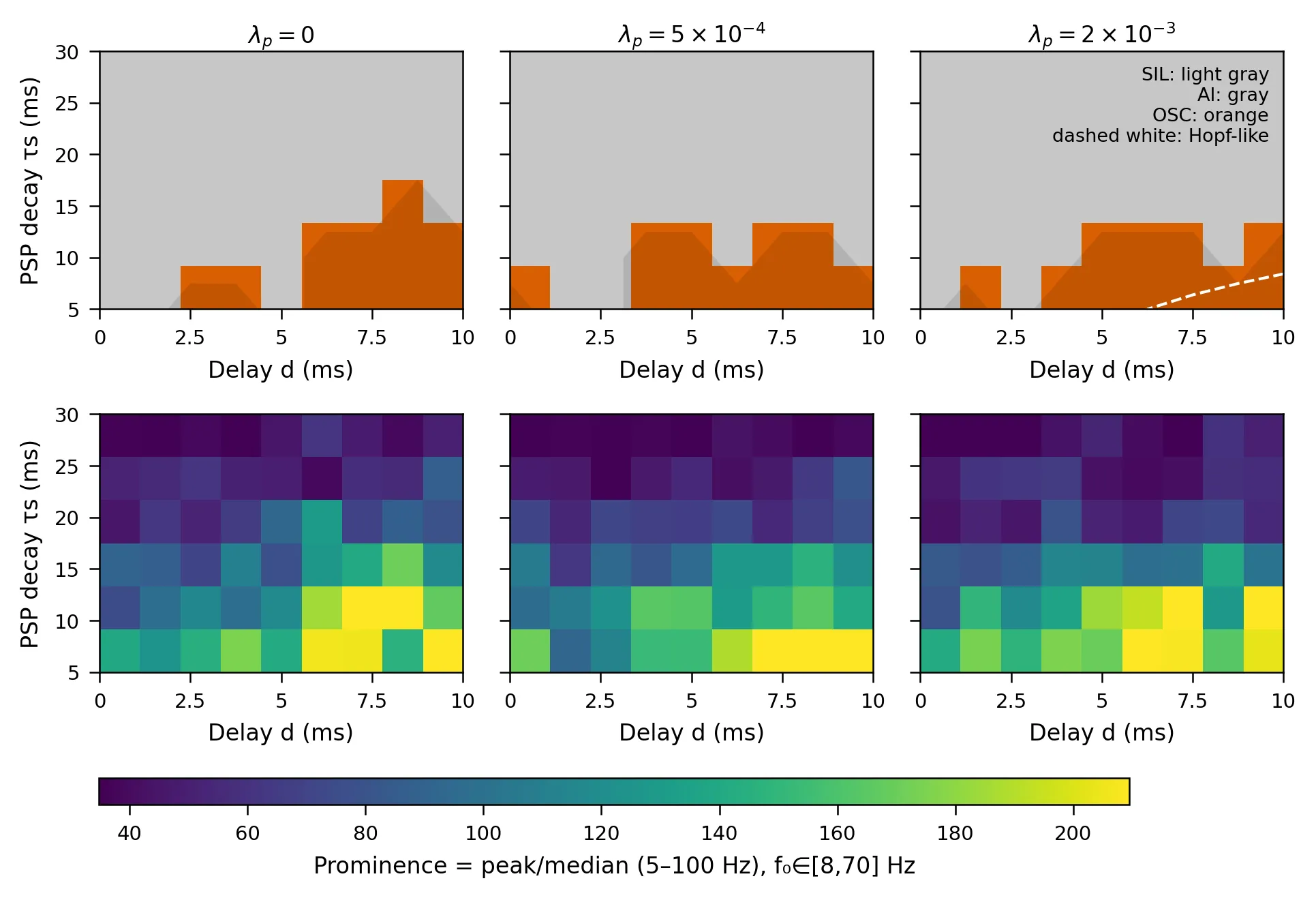 Balanced spiking networks can transition between silent, asynchronous-irregular, and oscillatory states depending on interacting synaptic and temporal time scales, while their joint parameter structure remains incompletely characterized. In this work, we systematically map how postsynaptic decay (τs), conduction delay (d), and plasticity rate (λp) jointly shape oscillatory regimes in recurrent leaky integrate-and-fire networks. By combining Brian2 simulations across the (τs, d, λp) space with a coarse Hopf-reference boundary, we construct regime maps that directly visualize SIL-AI-OSC transitions and corresponding spectral prominence landscapes. The mapped results show that increasing λp expands oscillatory regions toward shorter τs and moderate-to-long delays, while prominence maps identify parameter regions with the strongest rhythmic coherence. Representative control experiments further connect this global landscape to local rhythm-forming mechanisms, showing that STDP freezing weakens rhythmic coherence whereas delay jitter enhances it with minimal change in mean firing rate. As a result, these findings provide a useful reference for operating-point selection, synchrony modulation studies, and future biologically grounded spiking-network modeling within similar balanced-network settings.