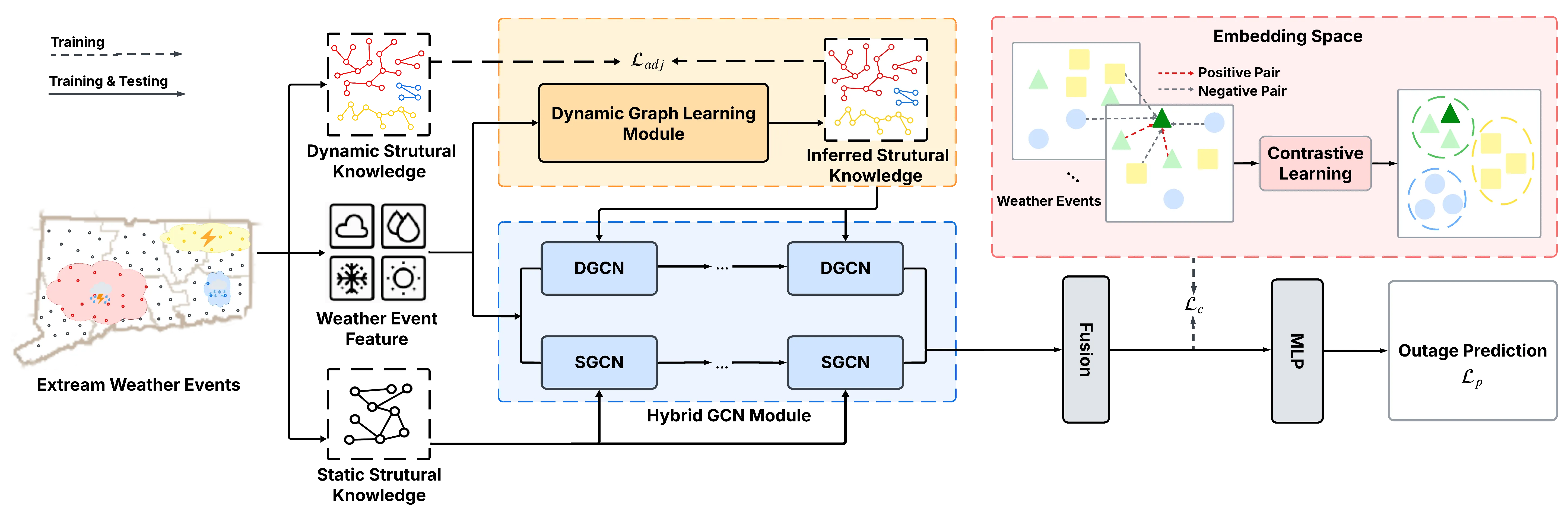 Extreme weather events, such as severe storms, hurricanes, snowstorms, and ice storms, which are exacerbated by climate change, frequently cause widespread power outages. These outages halt industrial operations, impact communities, damage critical infrastructure, profoundly disrupt economies, and have far-reaching effects across various sectors. To mitigate these effects, the University of Connecticut and Eversource Energy Center have developed an outage prediction modeling (OPM) system to provide pre-emptive forecasts for electric distribution networks before such weather events occur. However, existing predictive models in the system do not incorporate the spatial effect of extreme weather events. To this end, we develop Spatially Aware Hybrid Graph Neural Networks (SA-HGNN) with contrastive learning to enhance the OPM predictions for extreme weather-induced power outages. Specifically, we first encode spatial relationships of both static features (e.g., land cover, infrastructure) and event-specific dynamic features (e.g., wind speed, precipitation) via Spatially Aware Hybrid Graph Neural Networks (SA-HGNN). Next, we leverage contrastive learning to handle the imbalance problem associated with different types of extreme weather events and generate location-specific embeddings by minimizing intra-event distances between similar locations while maximizing inter-event distances across all locations. Thorough empirical studies in four utility service territories, i.e., Connecticut, Western Massachusetts, Eastern Massachusetts, and New Hampshire, demonstrate that SA-HGNN can achieve state-of-the-art performance for power outage prediction.