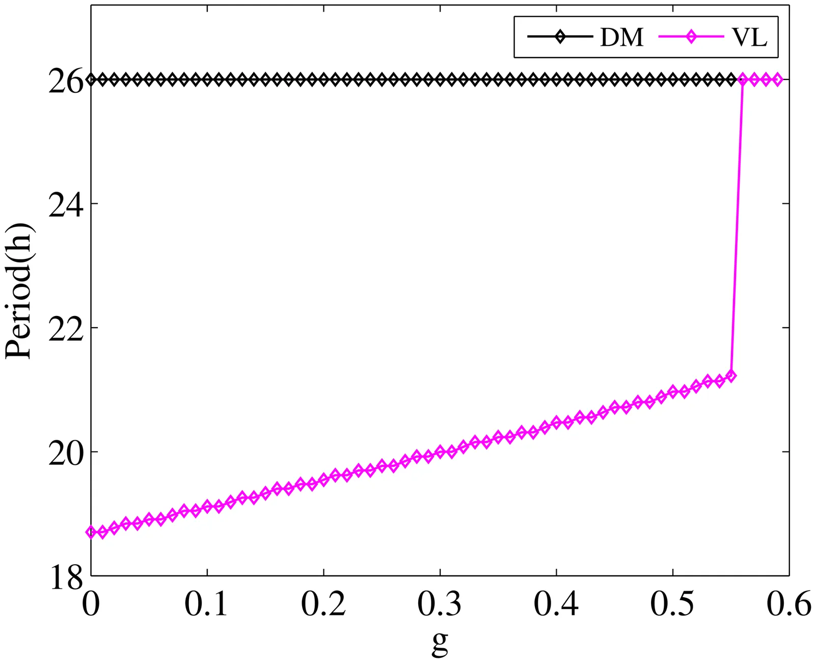 The synchronization of biological activity with the alternation of day and night (circadian rhythm) is performed in the brain by a group of neurons, constituting the suprachiasmatic nucleus (SCN). The SCN is divided into two subgroups of oscillating cells: the ventro-lateral (VL) neurons, which are exposed to light (photic signal) and the dorso-medial (DM) neurons which are coupled to the VL cells. When the coupling between these neurons is strong enough, the system synchronizes with the photic period. Upon increasing the cell coupling, the entrainment of the DM cells has been recently shown to occur via a very sharp (jumping) transition when the period of the photic input is larger than the intrinsic period of the cells. Here, we characterize this transition with a simple realistic model. We show that two bifurcations possibly lead to the disappearance of the endogenous mode. Using a mean field model, we show that the jumping transition results from a supercritical Hopf-like bifurcation. This finding implies that both the period and strength of the stimulating photic signal, and the relative fraction of cells in the VL and DM compartments are crucial in determining the synchronization of the system.