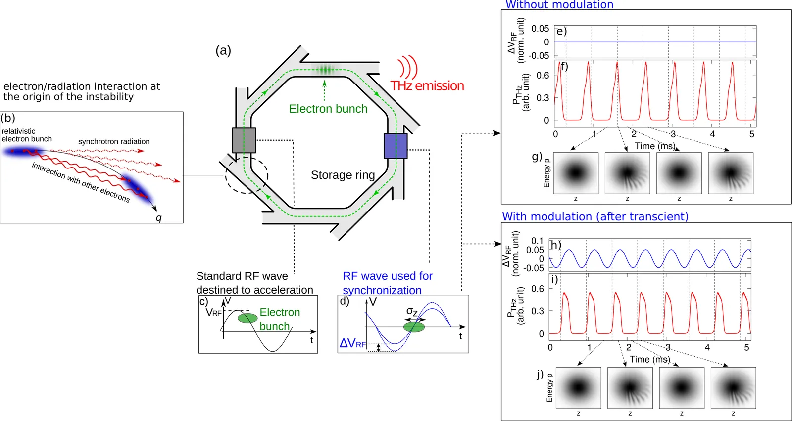 Synchronization is a fundamental phenomenon in dynamical systems, occurring in a wide range of contexts such as mechanical, chemical, biological, and social systems. In this work, we explore a novel manifestation of synchronization in accelerator-based light sources, specifically in storage rings where relativistic electron bunches circulate and emit synchrotron radiation, used for user experiments. In such systems, a systematic spatio-temporal instability arises when the bunch contains a large number of electrons. This instability is characterized by the spontaneous formation of microstructures within the bunch, which appear with a bursting behavior. We demonstrate that these bursting events can be synchronized with an external sinusoidal signal by modulating the electric field in a radiofrequency (RF) cavity. This external modulation induces typical synchronization features such as Arnold tongues at fundamental, harmonic, and subharmonic frequencies of the natural bursting rate, as well as phase-slip phenomena near the synchronization threshold. The synchronization mechanism is analyzed using numerical simulations based on the Vlasov-Fokker-Planck equation, and a proof-of-principle experiment is conducted at the SOLEIL synchrotron facility.