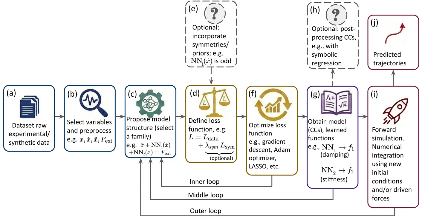 Data-driven equation discovery aims to reconstruct governing equations directly from empirical observations. A fundamental challenge in this domain is the ill-posed nature of the inverse problem, where multiple distinct mathematical models may yield similar errors, thus complicating model selection and failing to guarantee a unique representation of the underlying mechanisms. This issue can be addressed by incorporating inductive biases to constrain the search space and discard the undesirable models. The characteristic curves-based (CCs) framework offers a modular approach ideally suited to this aim. This approach is based on the specification of structural families that possess provable identifiability properties. Crucially, this framework enables practitioners to embed domain expertise directly into the learning process and facilitates the integration of diverse post-processing tools. In this work, we build upon the recent neural network implementation of this formalism (NN-CC), which benefits from the universal approximation capabilities of NNs. Specifically, we extend NN-CC by introducing two inductive biases: (i) symmetry constraints and (ii) post-processing with symbolic regression. Using a chaotic Duffing oscillator and a discontinuous stick-slip model under varying Gaussian noise levels, we show how these extensions systematically improve the discovery process. We also analyze the integration of sparse and symbolic regression (using SINDy and PySR) into the CC-based formalism. These extensions (SINDy-CC and SR-CC) consistently show improvements as prior information is incorporated. By enabling the integration of prior or hypothesized knowledge into the learning and post-processing stages, the CC-based formalism emerges as a promising candidate to address identifiability issues in purely data-driven methods, advancing the goal of interpretable and reliable system identification.