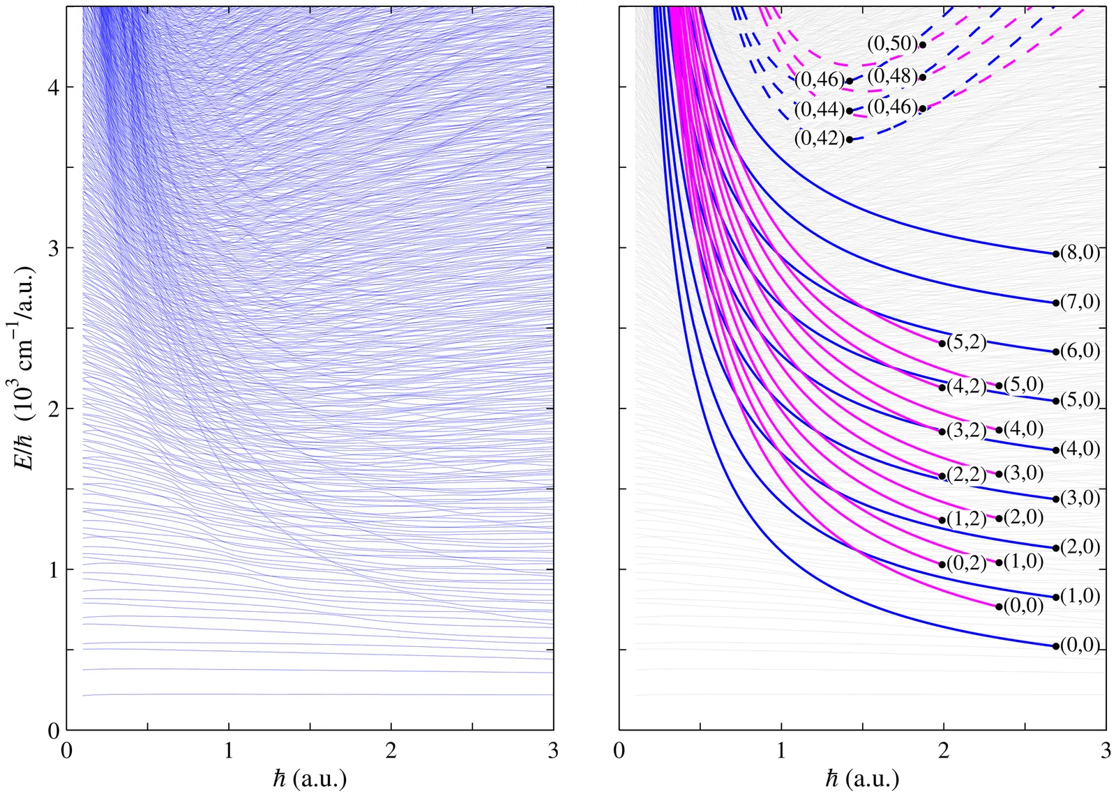 The correlation diagrams of vibrational energy levels considering the Planck constant as a variable parameter have proven as a very useful tool to study vibrational molecular states, and more specifically in relation to the quantum manifestations of chaos in such dynamical systems. In this paper, we consider the highly nonlinear K-CN molecule, showing how the regular classical structures, i.e., Kolmogorov-Arnold-Moser tori, existing in the mixed classical phase space appear in the quantum levels correlation diagram as emerging diabatic states, something that remains hidden when only the actual value of the Planck constant is considered. Additionally, a quantum transition from order to chaos is unveiled with the aid of these correlation diagrams, where it appears as a frontier of scarred functions.