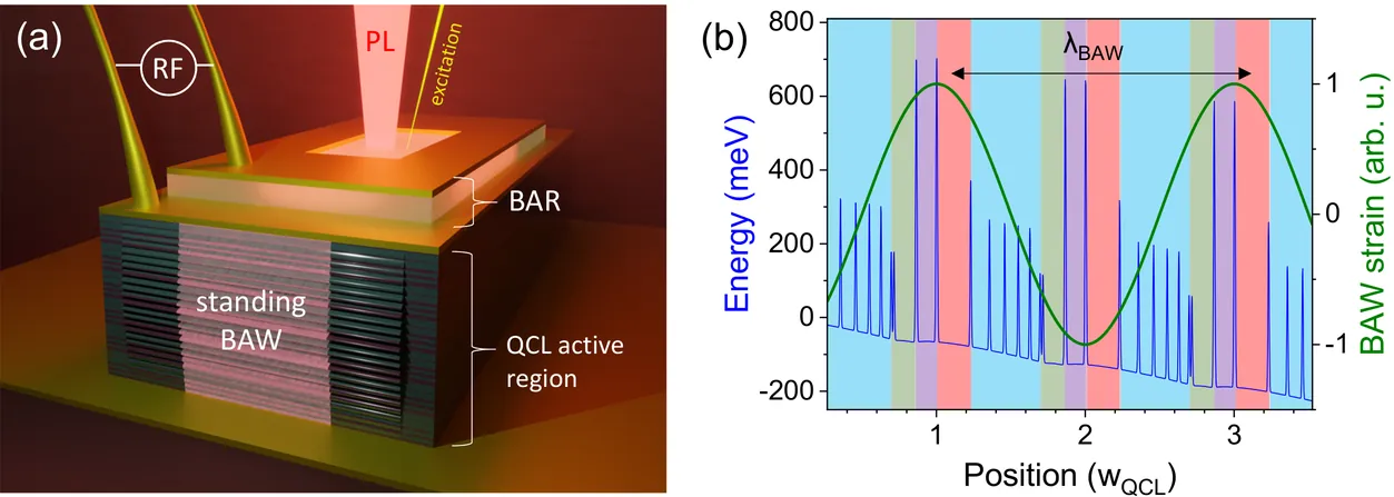 Active frequency comb generation and waveform control are central challenges in the terahertz (THz) domain. In THz quantum cascade lasers (QCLs), these functions have typically been achieved through active bias modulation, which alters the operating point of the device and imposes severe limitations on its flexibility. To address these challenges, we propose an approach based on the direct modulation of the QCL bandstructure using GHz-frequency standing bulk acoustic waves (BAWs), promising direct and localized control of the optical gain and chromatic dispersion. To this end, we fabricated a bulk acoustic transducer on top of a THz QCL in order to excite GHz standing BAWs within its active region. We demonstrate that radio-frequency driving of the transducer leads to the tunable generation of standing BAWs in 5-12 GHz frequency range with wavelengths commensurate to the QCL period length. The effect of the BAW on the QCL bandstructure is revealed by measuring photoluminescence (PL) of the active region, where the BAW strain leads to a considerable modulation of the PL energy up to a few meV around its non-modulated value. We also develop a model and perform bandstructure simulations to predict the effect of the BAW on the QCL subband structure and gain. These results mark the first demonstration of dynamic bandstructure modulation in a THz QCL using GHz acoustic strain, introducing a fundamentally new paradigm that establishes a powerful synergy between QCLs and BAWs towards coherent control and frequency comb engineering in the THz domain.