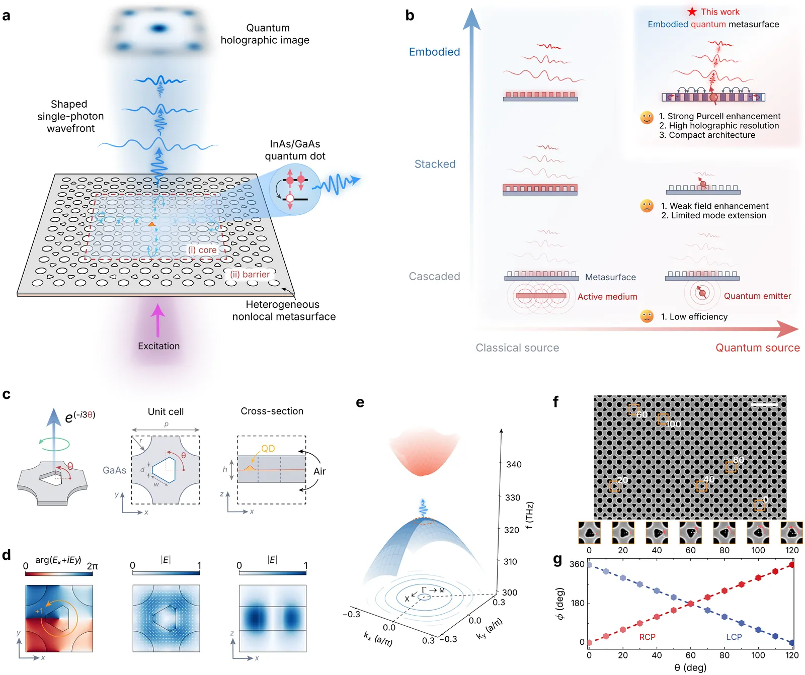 Structured quantum light is crucial for high-dimensional quantum information processing, yet its direct generation from quantum emitters remains challenging due to their intrinsic locality and omnidirectional radiation. Metasurfaces have been adopted for quantum-light wavefront shaping, typically in cascaded or stacked configurations that suffer from low efficiency and limited resolution. Here, we demonstrate a semiconductor metasource that directly embodies single quantum dots in a nonlocal GaAs metasurface. Spontaneous emission from quantum dot is efficiently funneled into an extended quasi-bound-state-in-the-continuum mode while sustaining strong mode-emitter overlap. A lateral core-barrier heterostructure tunes mode volume and spatial distribution to balance Purcell enhancement and holographic resolution. Using spatially modulated geometric phase, our compact metasource enables deterministic generation of diverse single-photon radiation patterns, including orbital-angular-momentum beams and holographic images. Our work brings versatile single-photon wavefront control into the nanoscale cavity quantum electrodynamics regime, offering a scalable route toward integrated sources of structured quantum light.