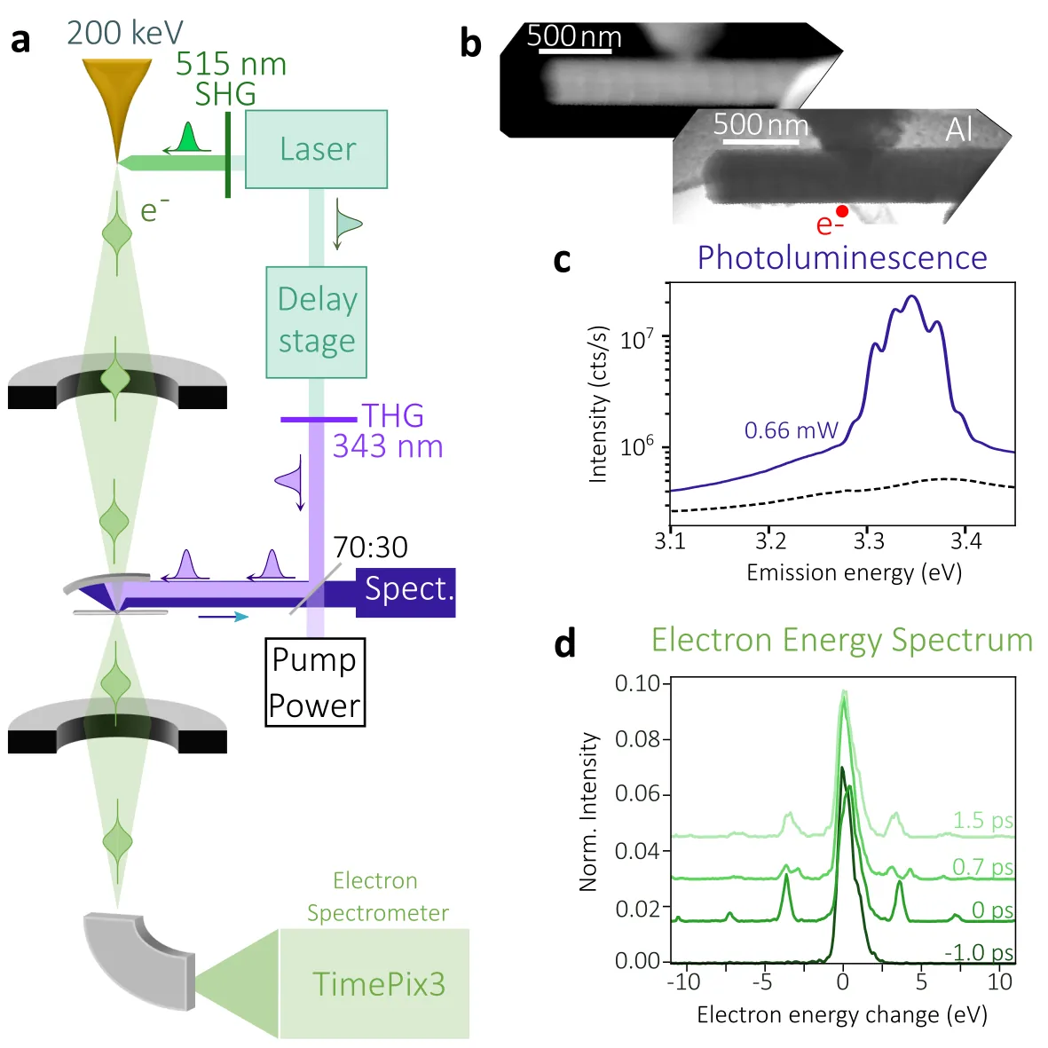 Integrated opto-electronic devices have the potential to revolutionize information processing, with substantial increase in computing speed, seamless information transfer and reduction of energy consumption. A key missing unit for the successful implementation of compact functional devices are nanometer scale modular and tunable light sources. Monotonically grown semiconducting nanowire lasers (NWLs) fill this gap. However, NWLs operation improvement and optimization require the characterization of their near-field and its dynamics at the nanometer scale, which is hindered due to the light diffraction limit. Here we show how synchronous electron near-field and photon far-field time-resolved spectroscopies surpass this limitation and map a NWLs near-field with nanometer and sub-picoseconds temporal resolution. We quantitatively measured the evolution of the absolute number of stimulated photons $N_0(t)$ in the NWL cavity, measuring that up to 4x10$^5$ are present simultaneously in the cavity. We mapped the lasing cavity mode's near-field, showing that both whispering gallery and Fabry-Perot modes can participate in the lasing. Our results demonstrate how the near-field of a NWL under operation evolves in the sub-picoseconds and the nanometer scales. We anticipate that a direct observation of the near-field will help to elucidate the influence of materials heterogeneities (defects, chemical changes, contaminants, interface roughness, strain) in NWL operation.