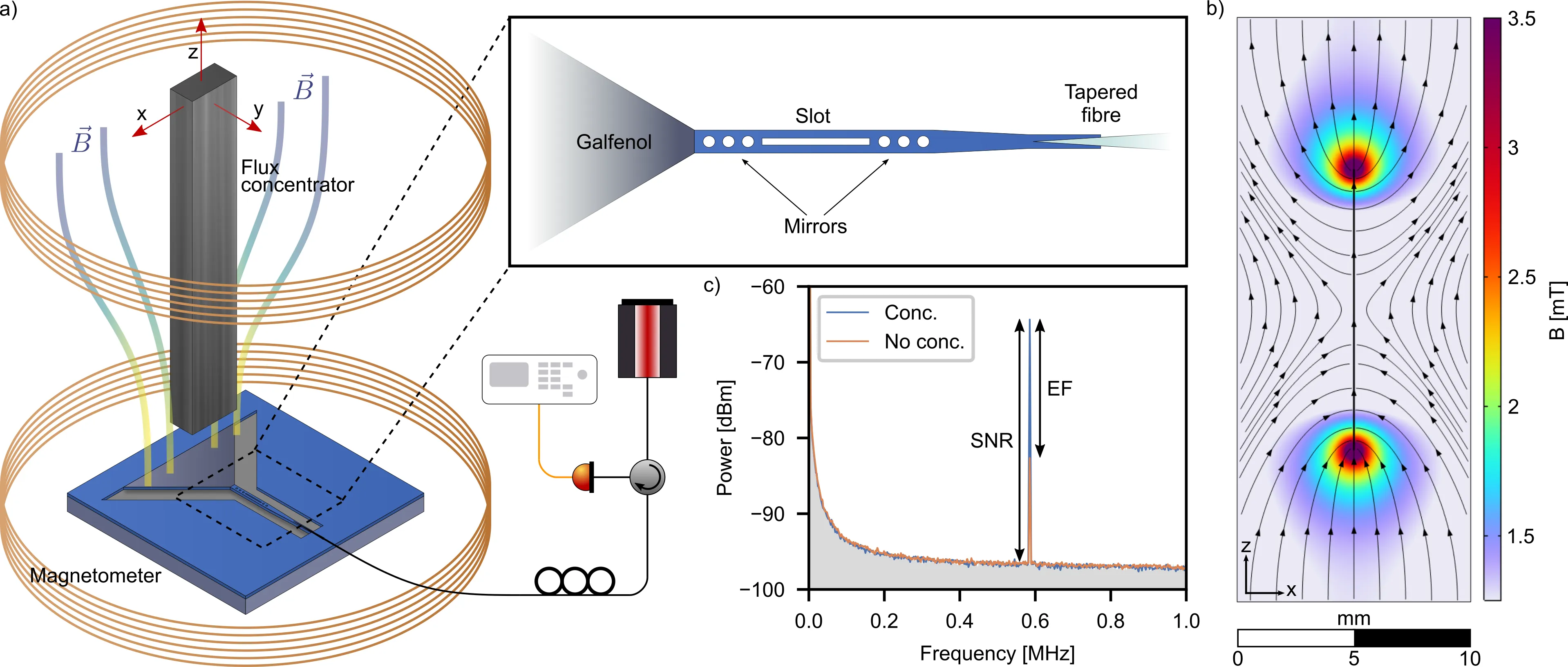 Low-frequency magnetic fields carry vital information for neuroscience, navigation, and Earth science. However, they are generally weak, making it challenging to measure them with compact, room-temperature magnetometers. To overcome this challenge, we combine an on-chip optomechanical magnetometer with a high-permeability flux concentrator. Beyond boosting sensitivity and bandwidth, exploiting the concentrator's nonlinear response converts low-frequency magnetic fluctuations into higher-frequency signals where the sensor is intrinsically most responsive. This sidesteps the technical noise that has long constrained the application of optomechanical magnetometry at low frequencies. Our measurements show order-of-magnitude improvements in sensitivity and extend performance into the sub-hertz regime, achieving below 20 nT Hz$^{-1/2}$ down to 3 Hz and less than 100 nT Hz$^{-1/2}$ at 0.1 Hz. Because this approach requires no redesign of the underlying architecture, it can be readily applied across magnetometer technologies, opening the way to practical low-frequency sensing for applications from brain activity mapping to undersea navigation and biomedical diagnostics.