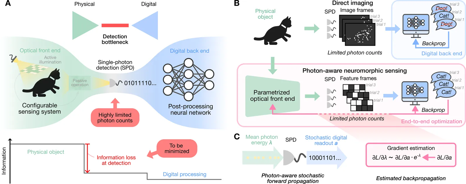 Machine vision, including object recognition and image reconstruction, is a central technology in many consumer devices and scientific instruments. The design of machine-vision systems has been revolutionized by the adoption of end-to-end optimization, in which the optical front end and the post-processing back end are jointly optimized. However, while machine vision currently works extremely well in moderate-light or bright-light situations -- where a camera may detect thousands of photons per pixel and billions of photons per frame -- it is far more challenging in very low-light situations. We introduce photon-aware neuromorphic sensing (PANS), an approach for end-to-end optimization in highly photon-starved scenarios. The training incorporates knowledge of the low photon budget and the stochastic nature of light detection when the average number of photons per pixel is near or less than 1. We report a proof-of-principle experimental demonstration in which we performed low-light image classification using PANS, achieving 73% (82%) accuracy on FashionMNIST with an average of only 4.9 (17) detected photons in total per inference, and 86% (97%) on MNIST with 8.6 (29) detected photons -- orders of magnitude more photon-efficient than conventional approaches. We also report simulation studies showing how PANS could be applied to other classification, event-detection, and image-reconstruction tasks. By taking into account the statistics of measurement results for non-classical states or alternative sensing hardware, PANS could in principle be adapted to enable high-accuracy results in quantum and other photon-starved setups.
