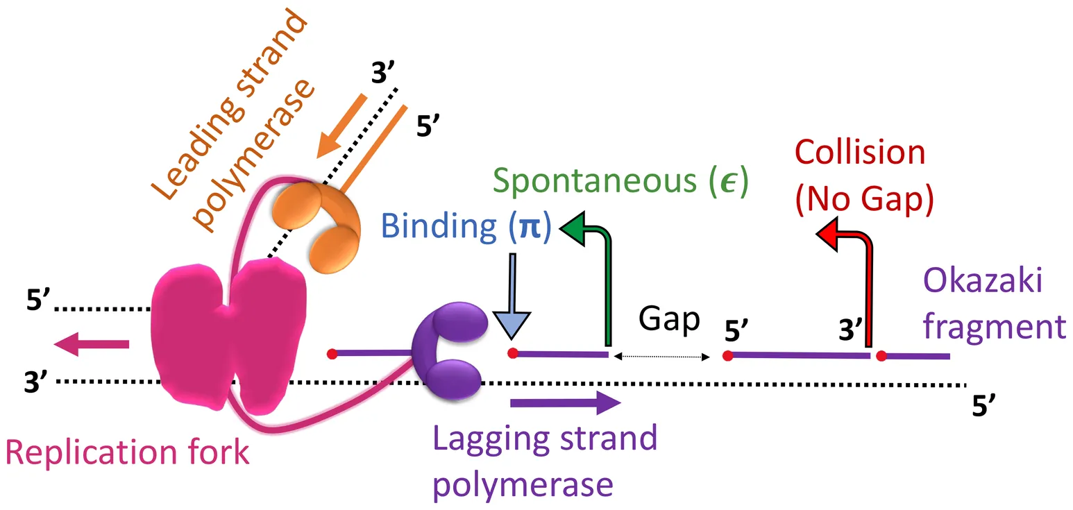 In biological cells, DNA replication is carried out by the replisome, a protein complex encompassing multiple DNA polymerases. DNA replication is semi-discontinuous: a DNA polymerase synthesizes one (leading) strand of the DNA continuously, and another polymerase synthesizes the other (lagging) strand discontinuously. Complex dynamics of the lagging-strand polymerase within the replisome result in the formation of short interim fragments, known as Okazaki fragments, and gaps between them. Although the semi-discontinuous replication is ubiquitous, a detailed characterization of it remains elusive. In this work, we develop a framework to investigate the semi-discontinuous replication by incorporating stochastic dynamics of the lagging-strand polymerase. Computing the size distribution of Okazaki fragments and gaps, we uncover the significance of the polymerase dissociation in shaping them. We apply the method to the previous experiment on the T4 bacteriophage replication system and identify the key parameters governing the polymerase dynamics. These results reveal that the collisions of lagging-strand polymerase with pre-synthesised Okazaki fragments primarily trigger its dissociation from the lagging strand.