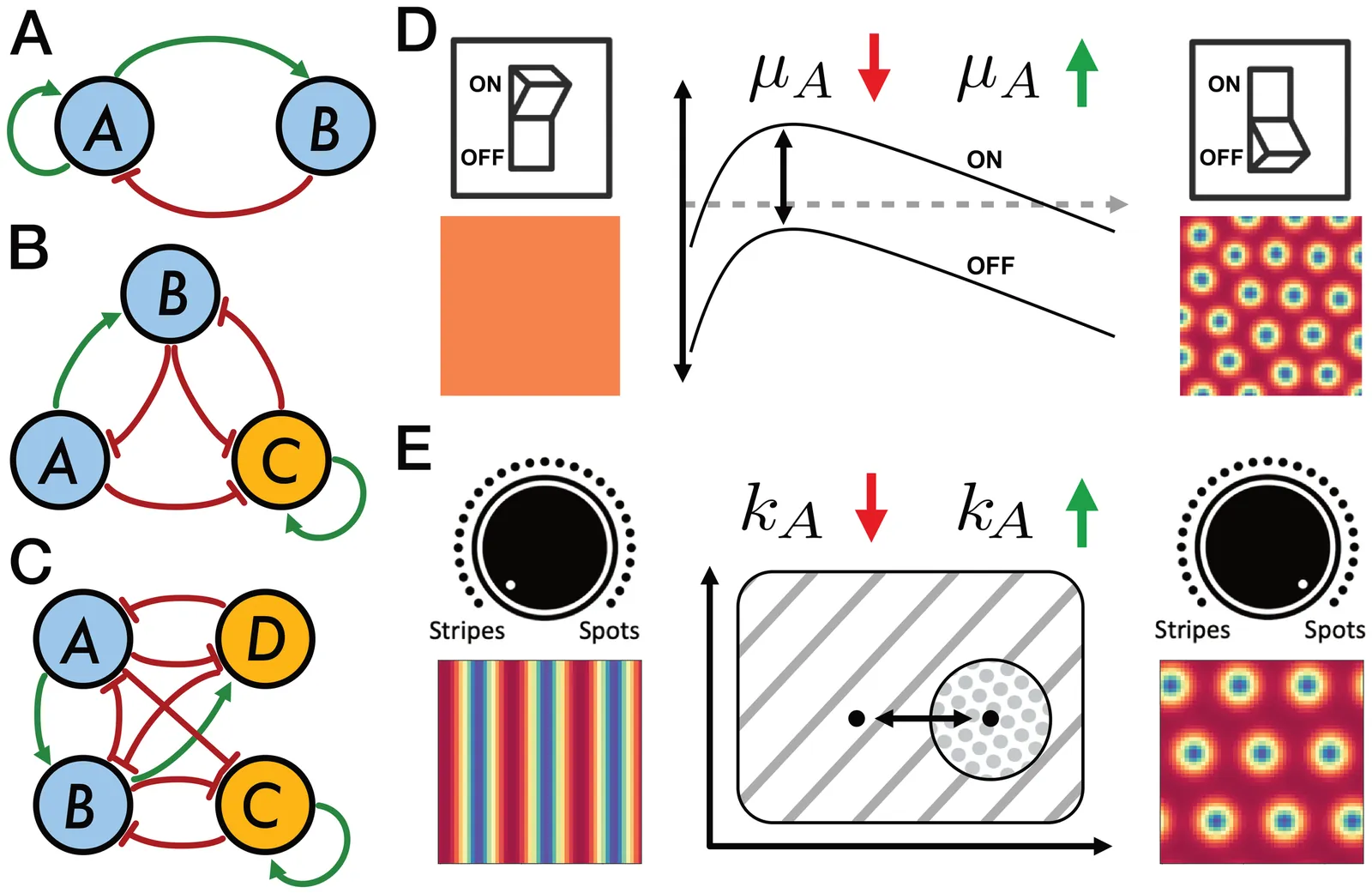Controlling spatial patterns in synthetic biological systems remains challenging due to poor parameter robustness and limited experimental tunability. We introduce two complementary mechanisms-the pattern switch and the pattern dial-to systematically control Turing pattern formation in gene circuits. The switch toggles pattern onset via a single parameter, while the dial enables transitions between distinct pattern types using weakly nonlinear amplitude equations. Analyzing network size reveals a key trade-off: small networks are easier to control but less robust, while larger networks gain robustness at the cost of tunability-suggesting a sweet spot for both evolvability and designability. Our results offer practical design rules for engineering programmable patterns in living systems.