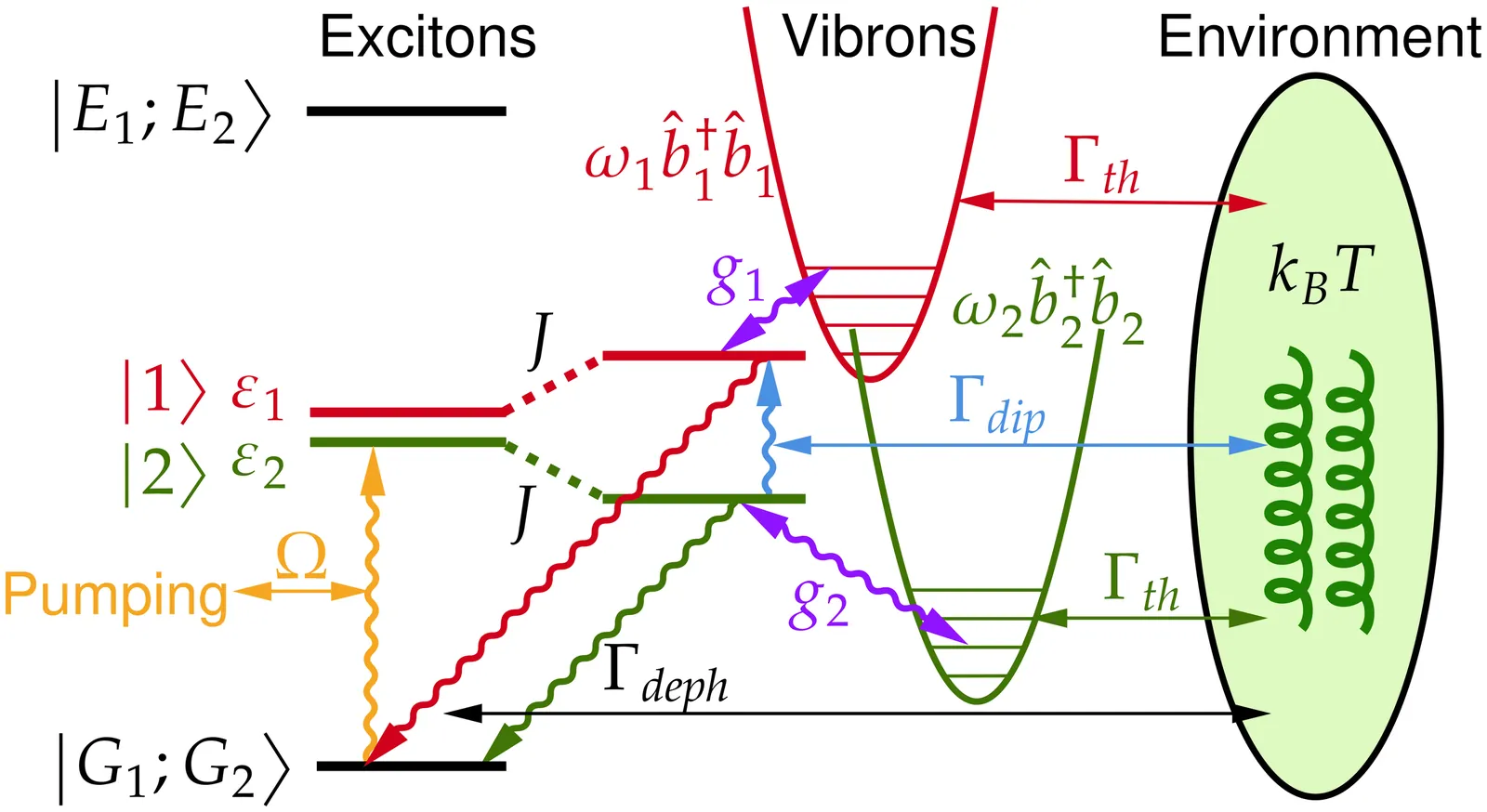Quantum synchronisation has recently been proposed as a mechanism for electronic excitation energy transfer in light-harvesting complexes, yet its robustness in driven-dissipative settings remains under active investigation. Here, we revisit this mechanism in cryptophyte photosynthetic antennae using an exciton--vibrational dimer model. By comparing the full open quantum dynamics with semi-classical rate equations for electronic density-matrix elements and vibrational observables, we demonstrate that quantum correlations between electronic and vibrational degrees of freedom, beyond the semi-classical factorised limit, underpin the emergence of quantum synchronisation. Furthermore, we introduce an environment-assisted transfer mechanism arising as a nonlinear, non-Condon correction to the dipole--dipole interaction. This mechanism enables long-lived quantum coherence and continuous, synchronisation-enhanced energy transfer in a driven-dissipative regime, thereby suggesting new avenues for investigating photosynthetic energy-transfer dynamics.