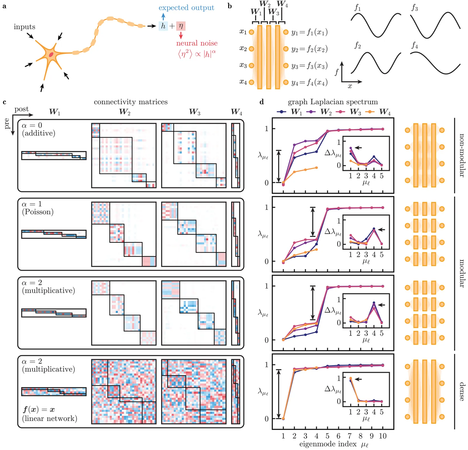 Circuits in the brain commonly exhibit modular architectures that factorise complex tasks, resulting in the ability to compositionally generalise and reduce catastrophic forgetting. In contrast, artificial neural networks (ANNs) appear to mix all processing, because modular solutions are difficult to find as they are vanishing subspaces in the space of possible solutions. Here, we draw inspiration from fault-tolerant computation and the Poisson-like firing of real neurons to show that activity-dependent neural noise, combined with nonlinear neural responses, drives the emergence of solutions that reflect an accurate understanding of modular tasks, corresponding to acquisition of a correct world model. We find that noise-driven modularisation can be recapitulated by a deterministic regulariser that multiplicatively combines weights and activations, revealing rich phenomenology not captured in linear networks or by standard regularisation methods. Though the emergence of modular structure requires sufficiently many training samples (exponential in the number of modular task dimensions), we show that pre-modularised ANNs exhibit superior noise-robustness and the ability to generalise and extrapolate well beyond training data, compared to ANNs without such inductive biases. Together, our work demonstrates a regulariser and architectures that could encourage modularity emergence to yield functional benefits.
