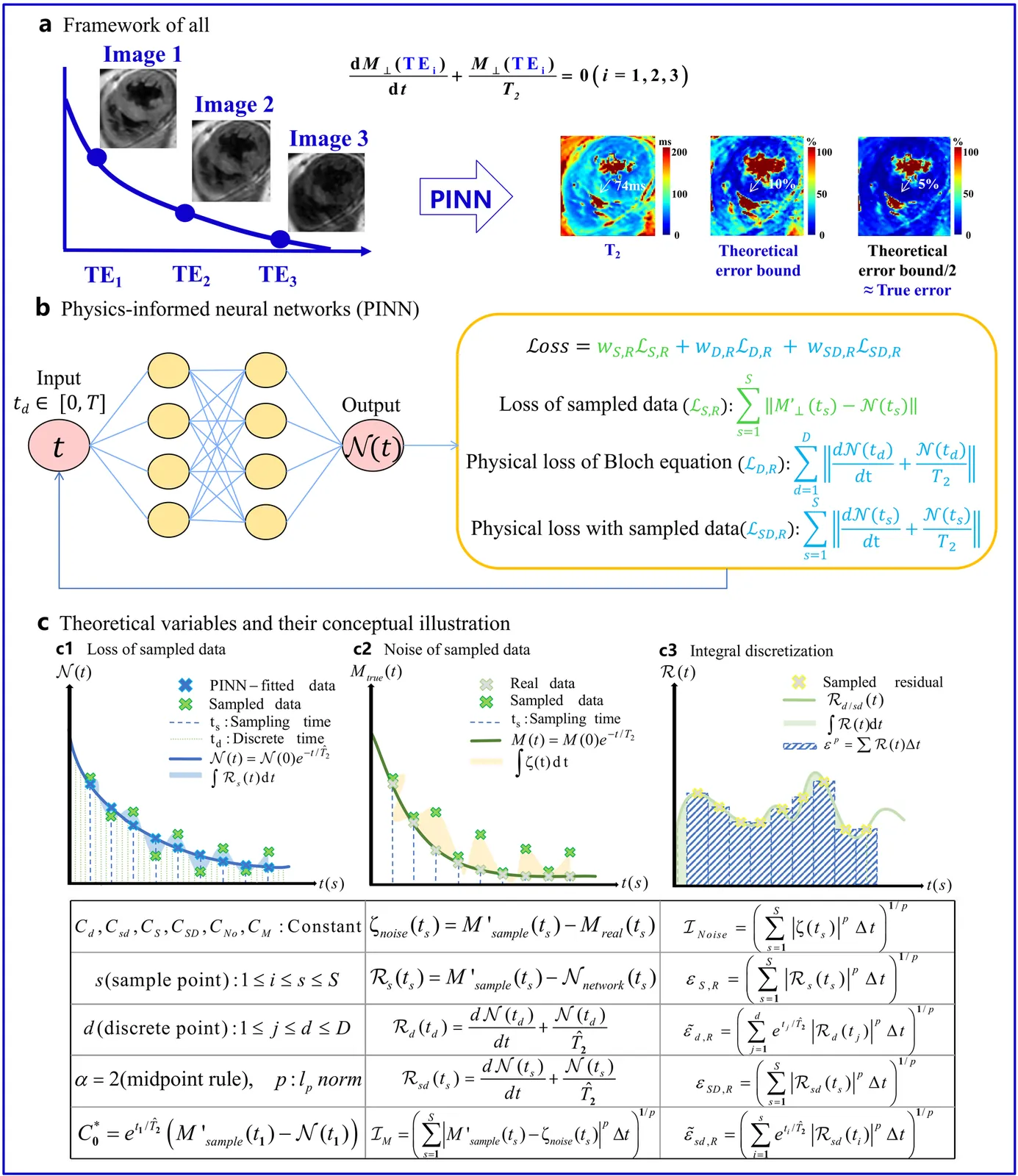 Physics-Informed Neural Networks (PINN) are emerging as a promising approach for quantitative parameter estimation of Magnetic Resonance Imaging (MRI). While existing deep learning methods can provide an accurate quantitative estimation of the T2 parameter, they still require large amounts of training data and lack theoretical support and a recognized gold standard. Thus, given the absence of PINN-based approaches for T2 estimation, we propose embedding the fundamental physics of MRI, the Bloch equation, in the loss of PINN, which is solely based on target scan data and does not require a pre-defined training database. Furthermore, by deriving rigorous upper bounds for both the T2 estimation error and the generalization error of the Bloch equation solution, we establish a theoretical foundation for evaluating the PINN's quantitative accuracy. Even without access to the ground truth or a gold standard, this theory enables us to estimate the error with respect to the real quantitative parameter T2. The accuracy of T2 mapping and the validity of the theoretical analysis are demonstrated on a numerical cardiac model and a water phantom, where our method exhibits excellent quantitative precision in the myocardial T2 range. Clinical applicability is confirmed in 94 acute myocardial infarction (AMI) patients, achieving low-error quantitative T2 estimation under the theoretical error bound, highlighting the robustness and potential of PINN.