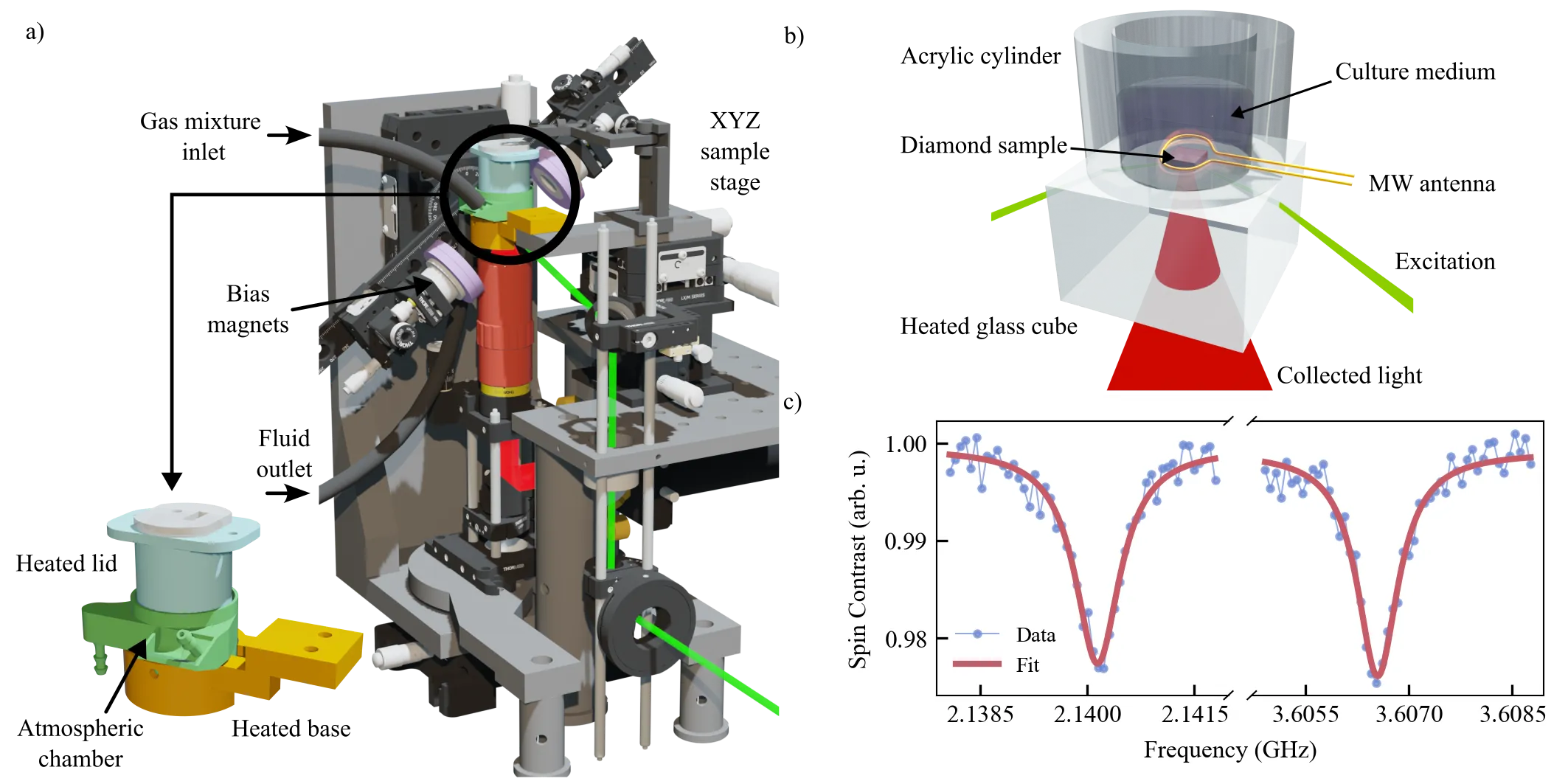Nitrogen-vacancy (NV) centers in diamond provide a versatile quantum sensing platform for biological imaging through magnetic field detection, offering unlimited photostability and the ability to perform long-term observations without photobleaching or phototoxicity. However, conventional stage-top incubators are incompatible with the unique requirements for NV widefield magnetometry to study cellular dynamics. Here, we present a purpose-built compact incubation platform that maintains precise environmental control of temperature, CO$_2$ atmosphere, and humidity while accommodating the complex constraints of NV widefield microscopy. The system employs a 3D-printed biocompatible chamber with integrated heating elements, temperature control, and humidified gas flow to create a stable physiological environment directly on the diamond sensing surface. We demonstrate sustained viability and proliferation of HT29 colorectal cancer cells over 90 hours of continuous incubation, with successful magnetic field imaging of immunomagnetically labeled cells after extended cultivation periods. This incubation platform enables long-term cultivation and real-time monitoring of biological samples on NV widefield magnetometry platforms, opening new possibilities for studying dynamic cellular processes using quantum sensing technologies.