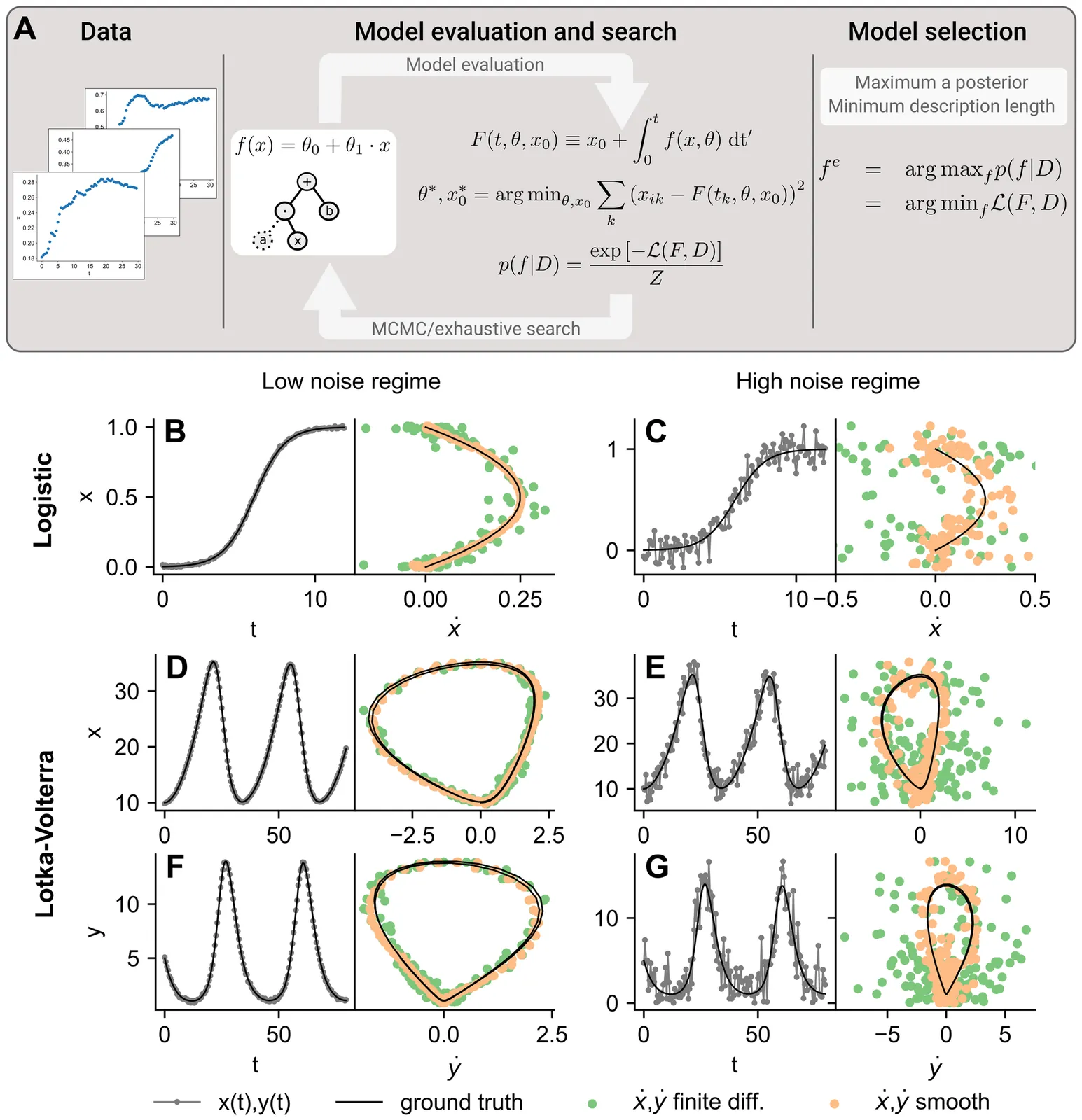 Understanding how systems evolve over time often requires discovering the differential equations that govern their behavior. Automatically learning these equations from experimental data is challenging when the data are noisy or limited, and existing approaches struggle, in particular, with the estimation of unobserved derivatives. Here, we introduce an integral Bayesian symbolic regression method that learns governing equations directly from raw time-series data, without requiring manual assumptions or error-prone derivative estimation. By sampling the space of symbolic differential equations and evaluating them via numerical integration, our method robustly identifies governing equations even from noisy or scarce data. We show that this approach accurately recovers ground-truth models in synthetic benchmarks, and that it makes quasi-optimal predictions of system dynamics for all noise regimes. Applying this method to bacterial growth experiments across multiple species and substrates, we discover novel growth equations that outperform classical models in accurately capturing all phases of microbial proliferation, including lag, exponential, and saturation. Unlike standard approaches, our method reveals subtle shifts in growth dynamics, such as double ramp-ups or non-canonical transitions, offering a deeper, data-driven understanding of microbial physiology.