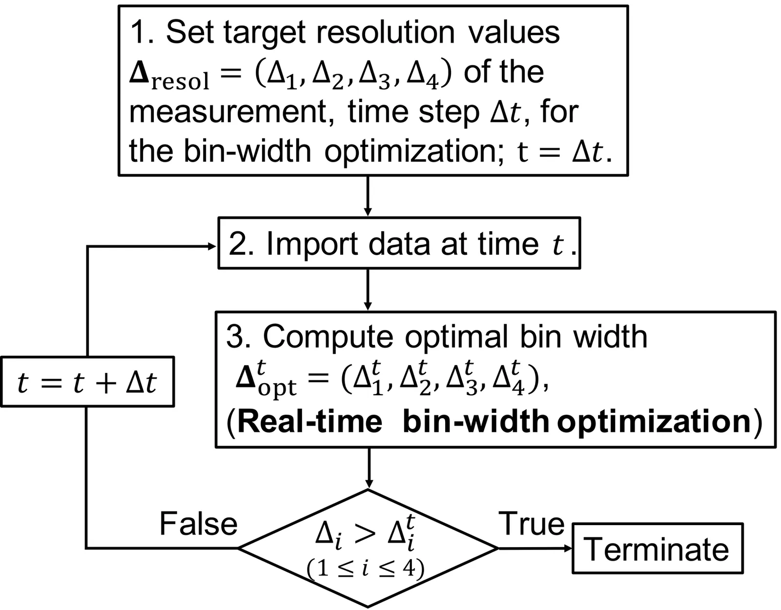Currently, an excessive amount of event data is being obtained in four-dimensional inelastic neutron-scattering experiments. A method for automatic bin-width optimization of multidimensional histograms has been developed and recently validated on real inelastic neutron-scattering data. However, measuring beyond the equipment resolution leads to inefficient use of valuable beam time. To improve experimental efficiency, an automatic termination strategy is essential. We propose a Bayesian-optimization-based method to compute stopping criteria and determine whether to continue or terminate the experiment in real time. In the proposed method, the bin-width optimization is performed using Bayesian optimization to efficiently compute the optimal bin widths. The experiment is terminated when the optimal bin widths become smaller than the target resolutions. In numerical experiments using real inelastic neutron-scattering data, the optimal bin widths decrease as the number of events increases. Even the optimal bin widths for data downsampled to 1/5 are comparable with the resolutions limited by the sample size, choppers, and so on. This implies excessive measurement of the inelastic neutron experiments for the moment. Moreover, we found that Bayesian optimization can reduce the search cost to approximately 10% of an exhaustive search in our numerical experiments.