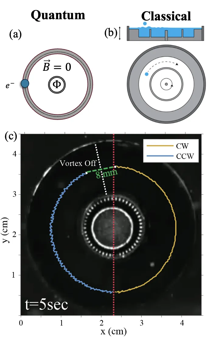 We report the results of an experimental study of an analog of the Aharonov-Bohm (AB) effect achieved with the hydrodynamic pilot-wave system. A walking droplet is confined to an annular cavity that encircles a shielded vortex, but lies outside its range of direct influence. While there is no vortex-induced flow in the immediate vicinity of the droplets, the vortex modifies the droplet's spatially extended pilot-wave field that guides its motion, producing a vortex-dependent bias in the droplet's orbital speed. High-speed tracking and delay-embedding reconstructions yield Wigner-like phase-space distributions for this hydrodynamic system that exhibits a rigid, flux-dependent translation, providing a force-free, gauge-like realization of an AB-type phase.