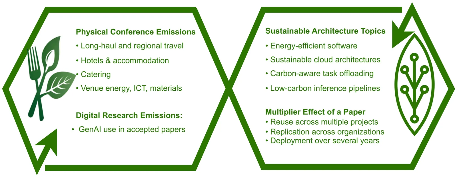 Generative AI (GenAI) tools are increasingly integrated into software architecture research, yet the environmental impact of their computational usage remains largely undocumented. This study presents the first systematic audit of the carbon footprint of both the digital footprint from GenAI usage in research papers, and the traditional footprint from conference activities within the context of the IEEE International Conference on Software Architecture (ICSA). We report two separate carbon inventories relevant to the software architecture research community: i) an exploratory estimate of the footprint of GenAI inference usage associated with accepted papers within a research-artifact boundary, and ii) the conference attendance and operations footprint of ICSA 2025 (travel, accommodation, catering, venue energy, and materials) within the conference time boundary. These two inventories, with different system boundaries and completeness, support transparency and community reflection. We discuss implications for sustainable software architecture, including recommendations for transparency, greener conference planning, and improved energy efficiency in GenAI operations. Our work supports a more climate-conscious research culture within the ICSA community and beyond
