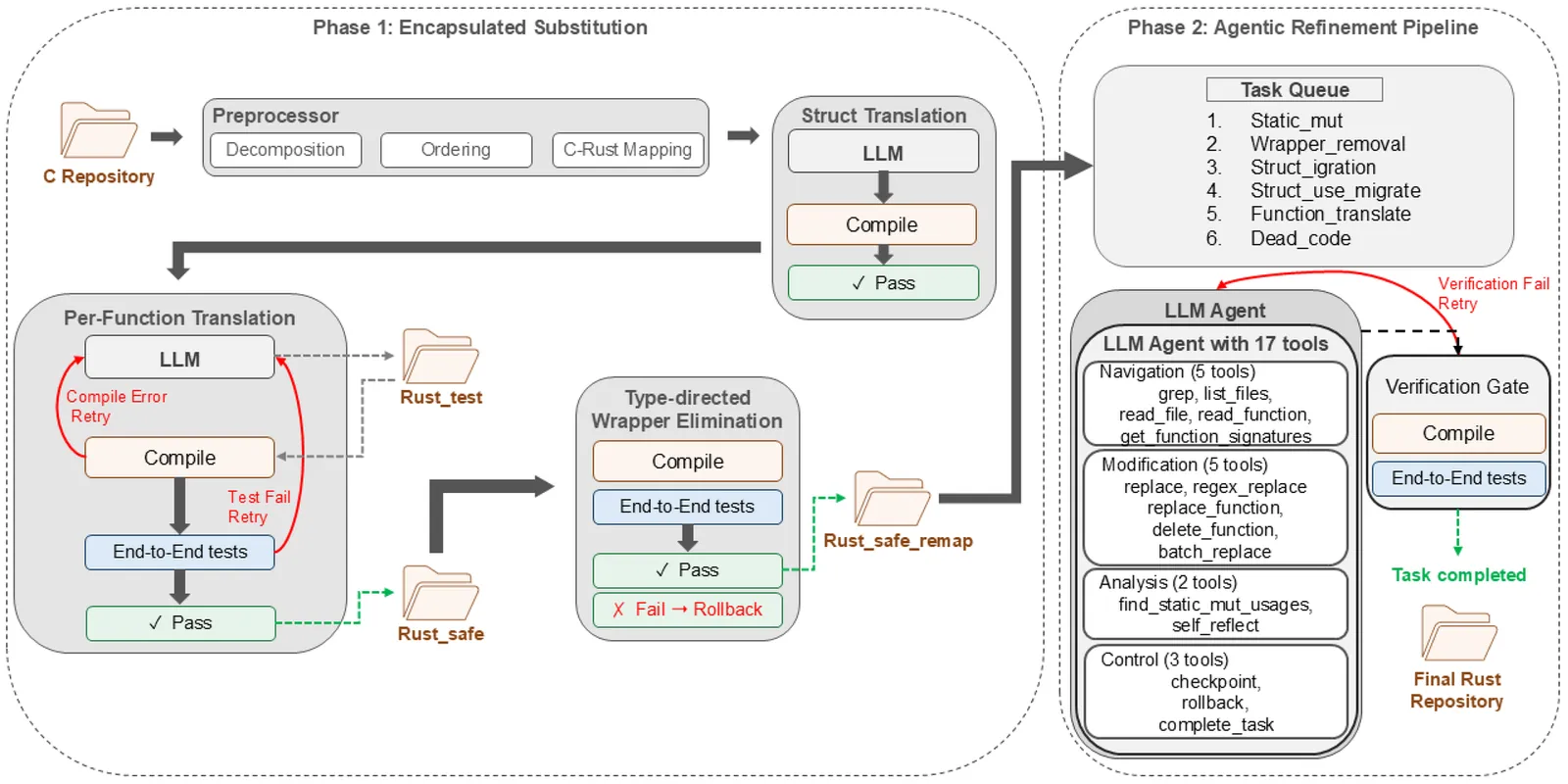 We present Encapsulated Substitution and Agentic Refinement on a Live Scaffold for Safe C-to-Rust Translation, a two-phase pipeline for translating real-world C projects to safe Rust. Existing approaches either produce unsafe output without memory-safety guarantees or translate functions in isolation, failing to detect cross-unit type mismatches or handle unsafe constructs requiring whole-program reasoning. Furthermore, function-level LLM pipelines require coordinated caller updates when type signatures change, while project-scale systems often fail to produce compilable output under real-world dependency complexity. Encrust addresses these limitations by decoupling boundary adaptation from function logic via an Application Binary Interface (ABI)-preserving wrapper pattern and validating each intermediate state against the integrated codebase. Phase 1 (Encapsulated Substitution) translates each function using an ABI-preserving wrapper that splits it into two components: a caller-transparent shim retaining the original raw-pointer signature, and a safe inner function targeted by the LLM with a clean, scope-limited prompt. This enables independent per-function type changes with automatic rollback on failure, without coordinated caller updates. A deterministic, type-directed wrapper elimination pass then removes wrappers after successful translation. Phase 2 (Agentic Refinement) resolves unsafe constructs beyond per-function scope, including static mut globals, skipped wrapper pairs, and failed translations, using an LLM agent operating on the whole codebase under a baseline-aware verification gate. We evaluate Encrust on 7 GNU Coreutils programs and 8 libraries from the Laertes benchmark, showing substantial unsafe-construct reduction across all 15 programs while maintaining full test-vector correctness.